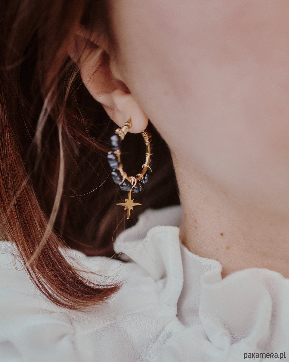 Kolczyki wykonane z naturalnych, czarnych pereł, ozdobione gwiazdką. Ten model sprawdzi się, jeśli częściej wybierasz koszulę ponad t-shirt. Wyjątkowy krój kolczyków z pewnością przyciągnie wiele spojrzeń i doda pewności siebie. Idealne na ważne wyjście, do eleganckich stylizacji oraz dla osób lubiących, gdy ich biżuterię widać. Naturalne perły i ręczna praca pokażą światu, że ich właścicielka lubi sięgać, po wyjątkowe projekty i wysoką jakość (˵ •̀ ᴗ - ˵ ) ✧