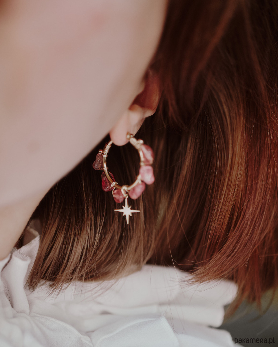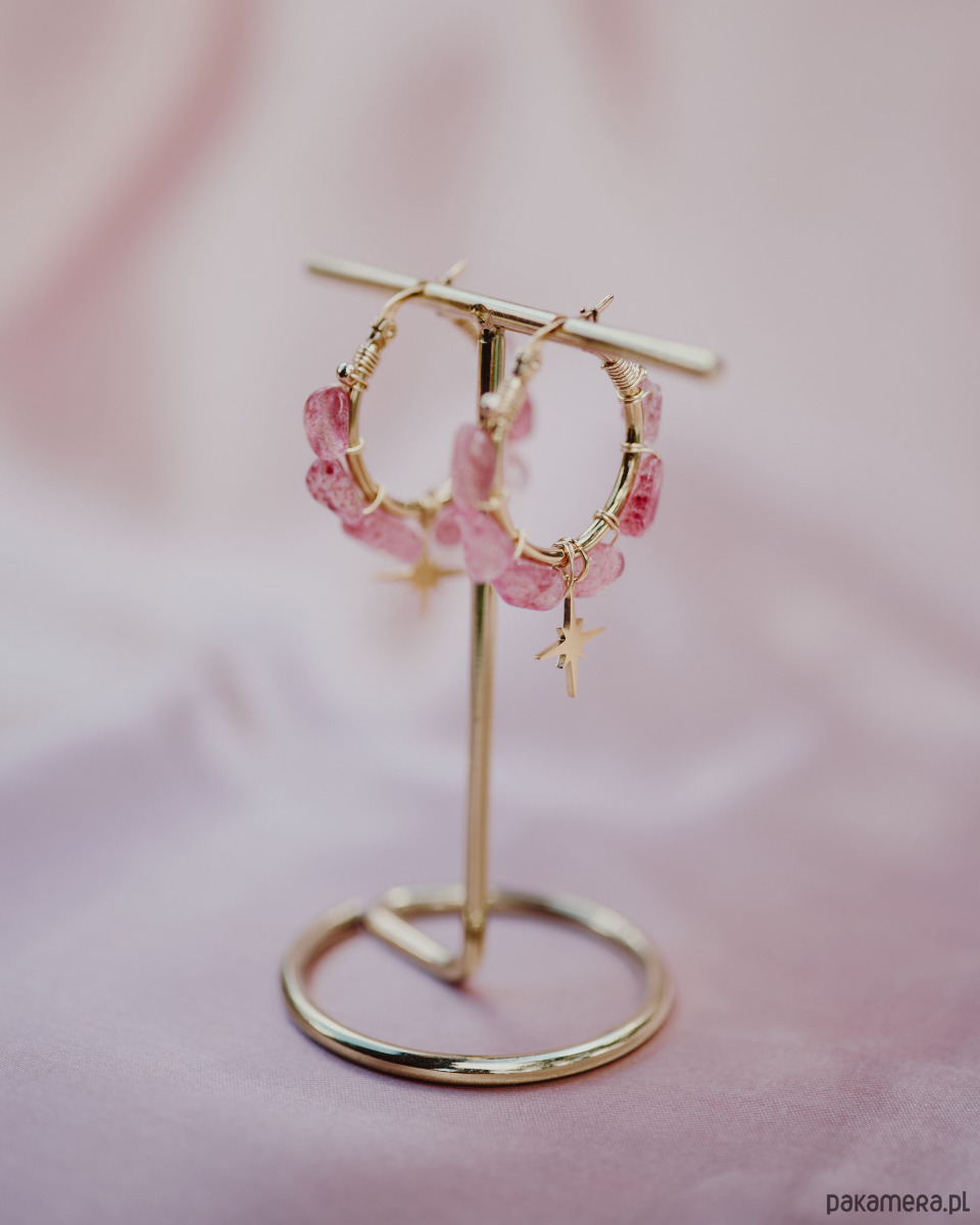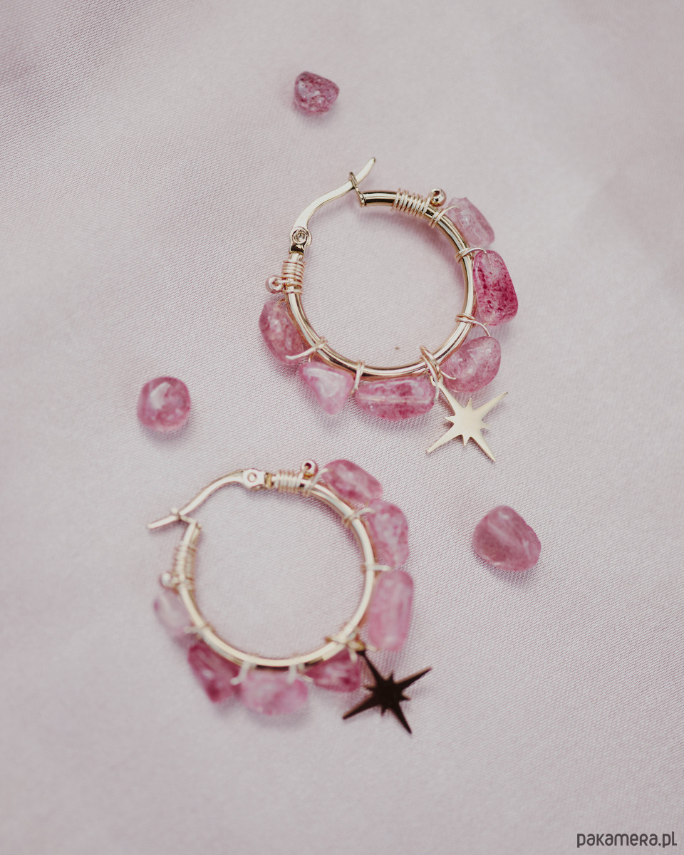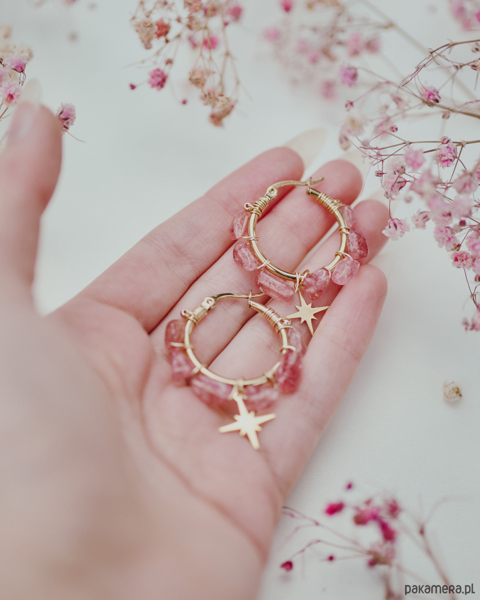 Kolczyki wykonane z naturalnego kwarcu truskawkowego ozdobione gwiazdką. Ten model sprawdzi się, jeśli częściej wybierasz koszulę ponad t-shirt. Wyjątkowy krój kolczyków z pewnością przyciągnie wiele spojrzeń i doda pewności siebie. Idealne na ważne wyjście, do eleganckich stylizacji oraz dla osób lubiących, gdy ich biżuterię widać. Naturalne kamienie i ręczna praca pokażą światu, że ich właścicielka lubi sięgać, po wyjątkowe projekty i wysoką jakość.