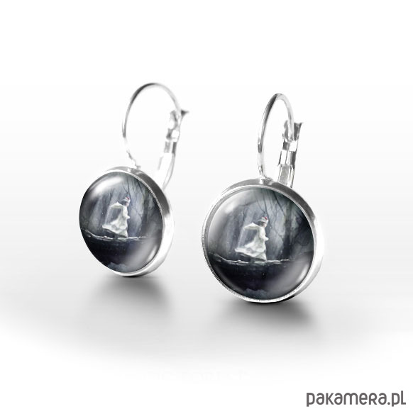 Grafika ukryta w prostych, eterycznych kolczykach, pod osłoną przeźroczystego półokrągłego szkiełka.