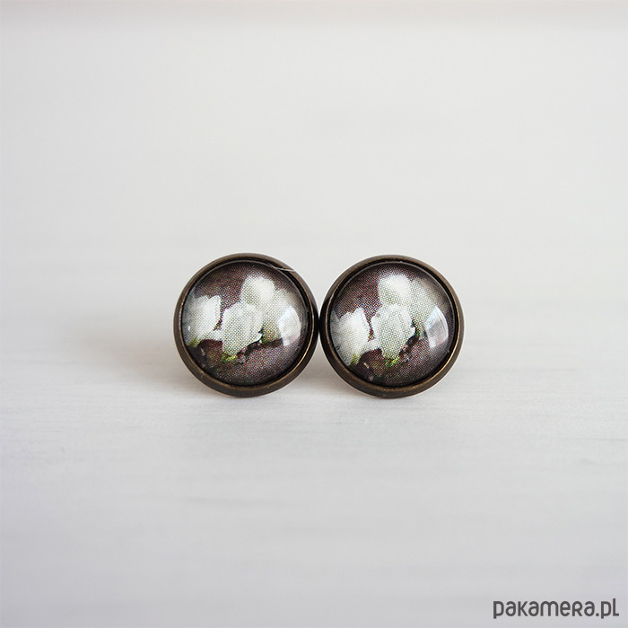Grafika ukryta w delikatnych, małych kolczykach, pod osłoną przeźroczystego półokrągłego szkiełka.