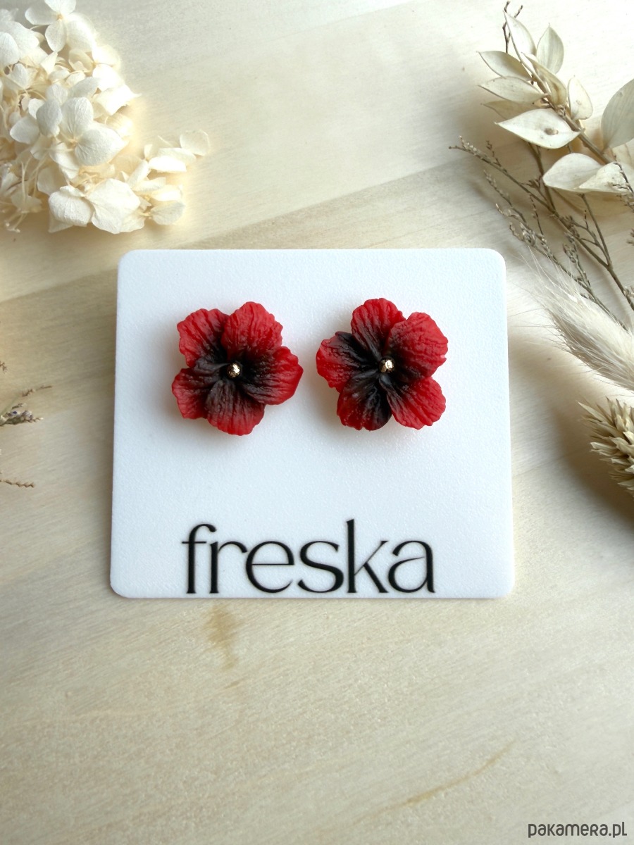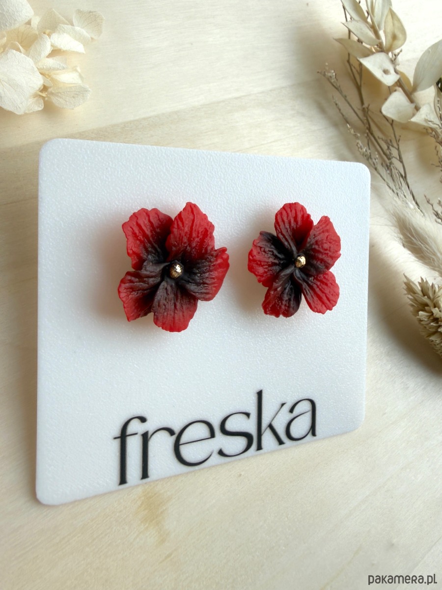 Te kolczyki to ręcznie wykonane, wyraziste sztyfty w kształcie czerwonych maków z gliny polimerowej o średnicy 25 mm, na sztyftach ze stali chirurgicznej – idealne również dla wrażliwych uszu.