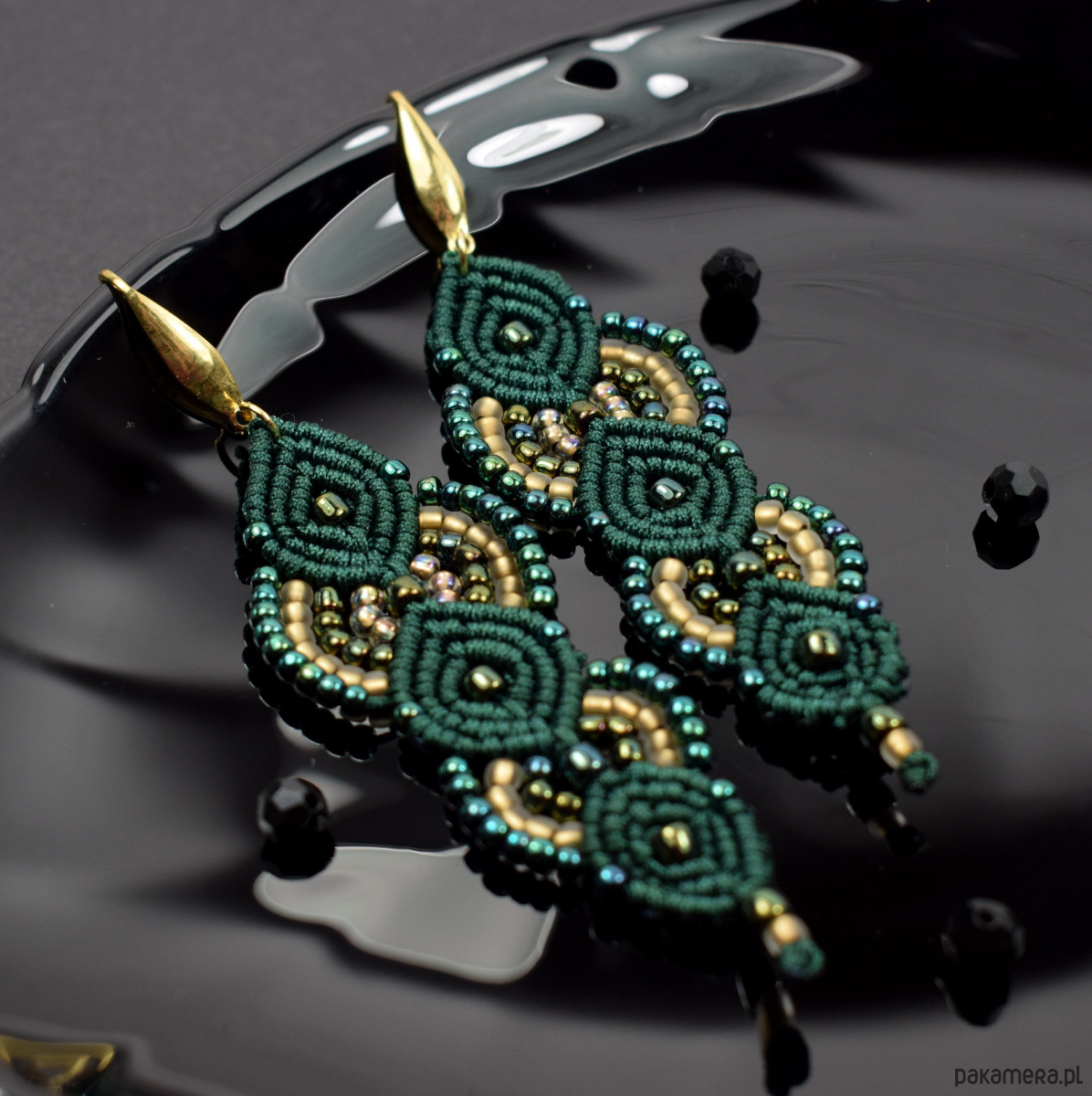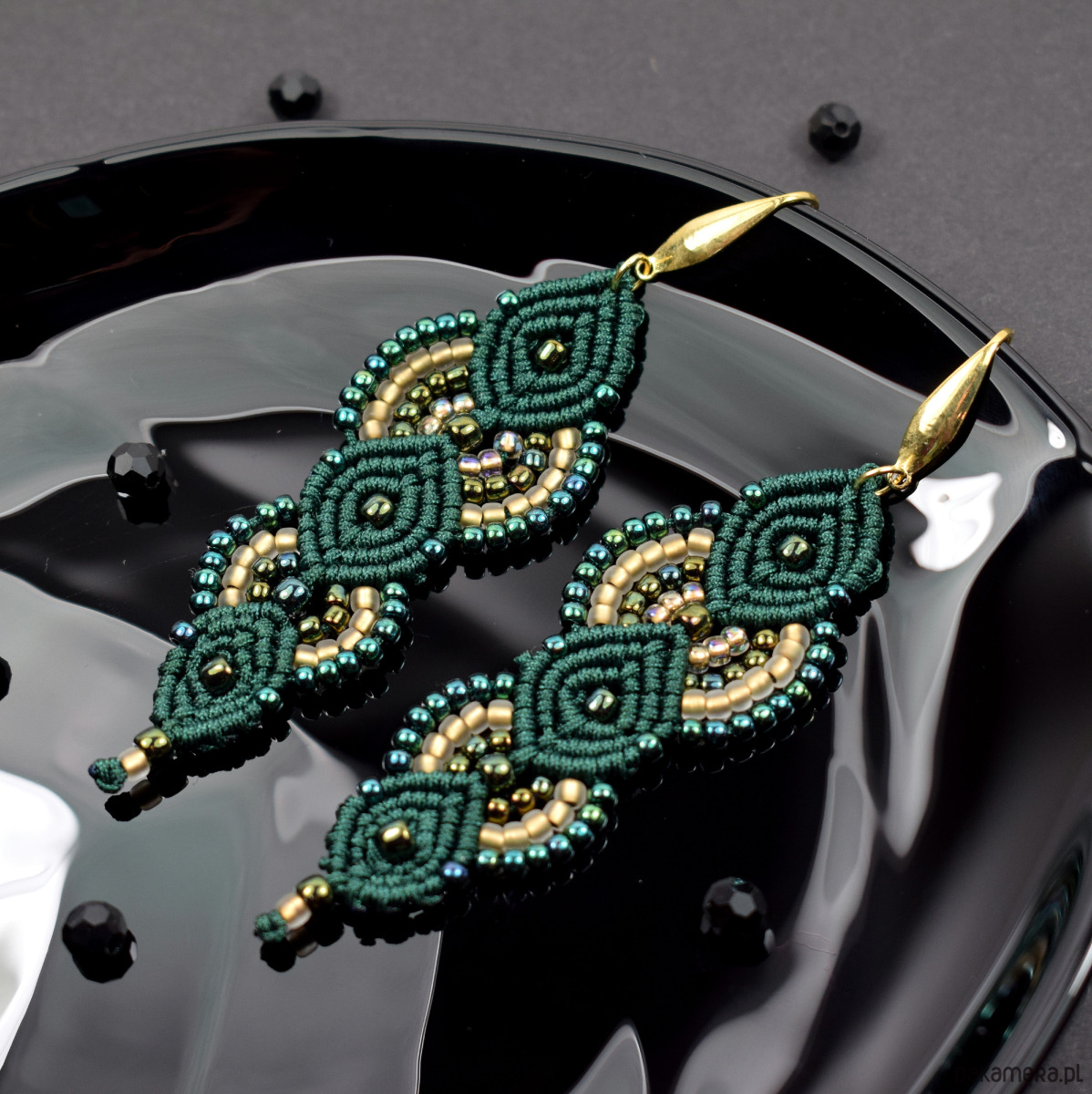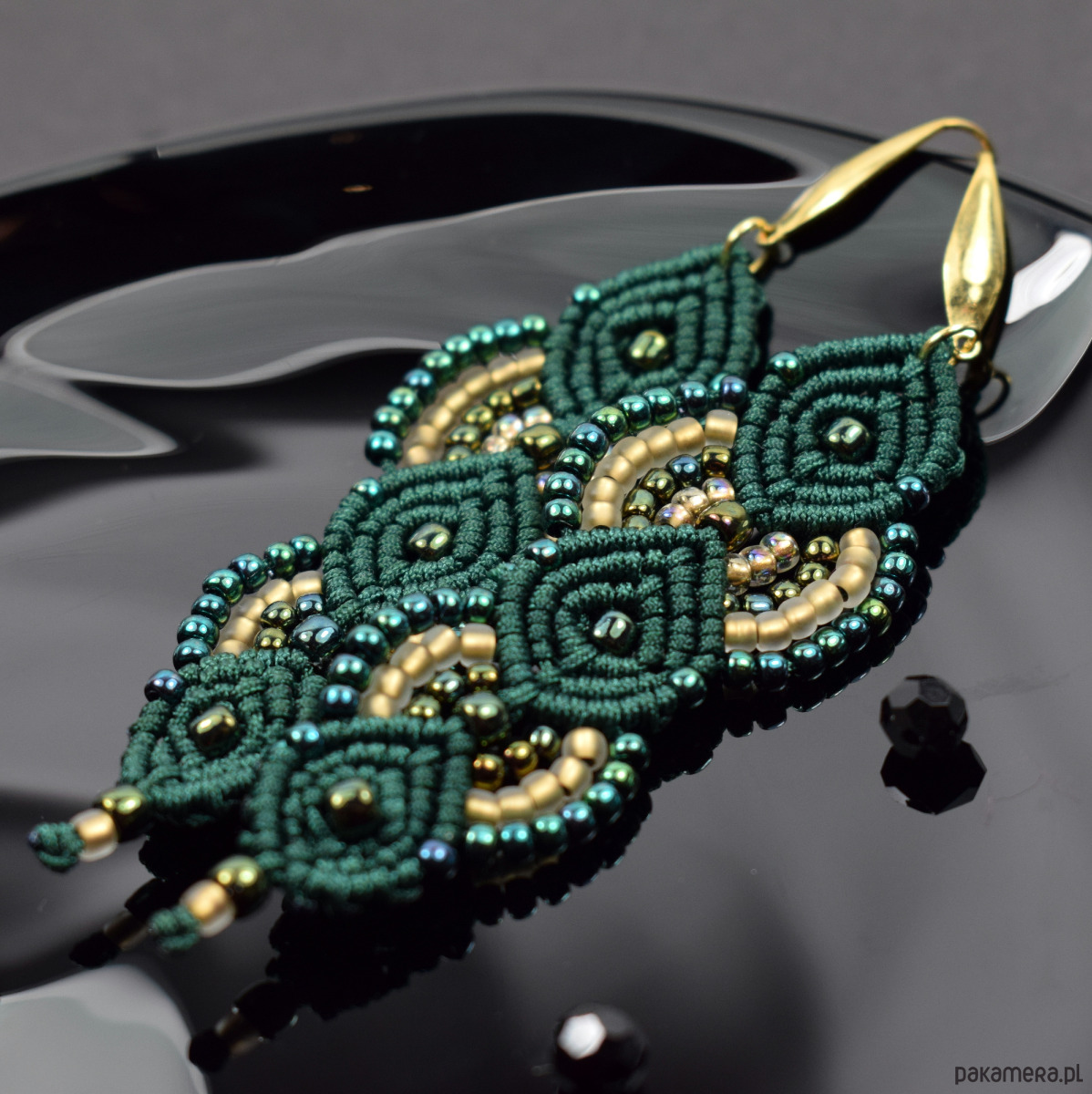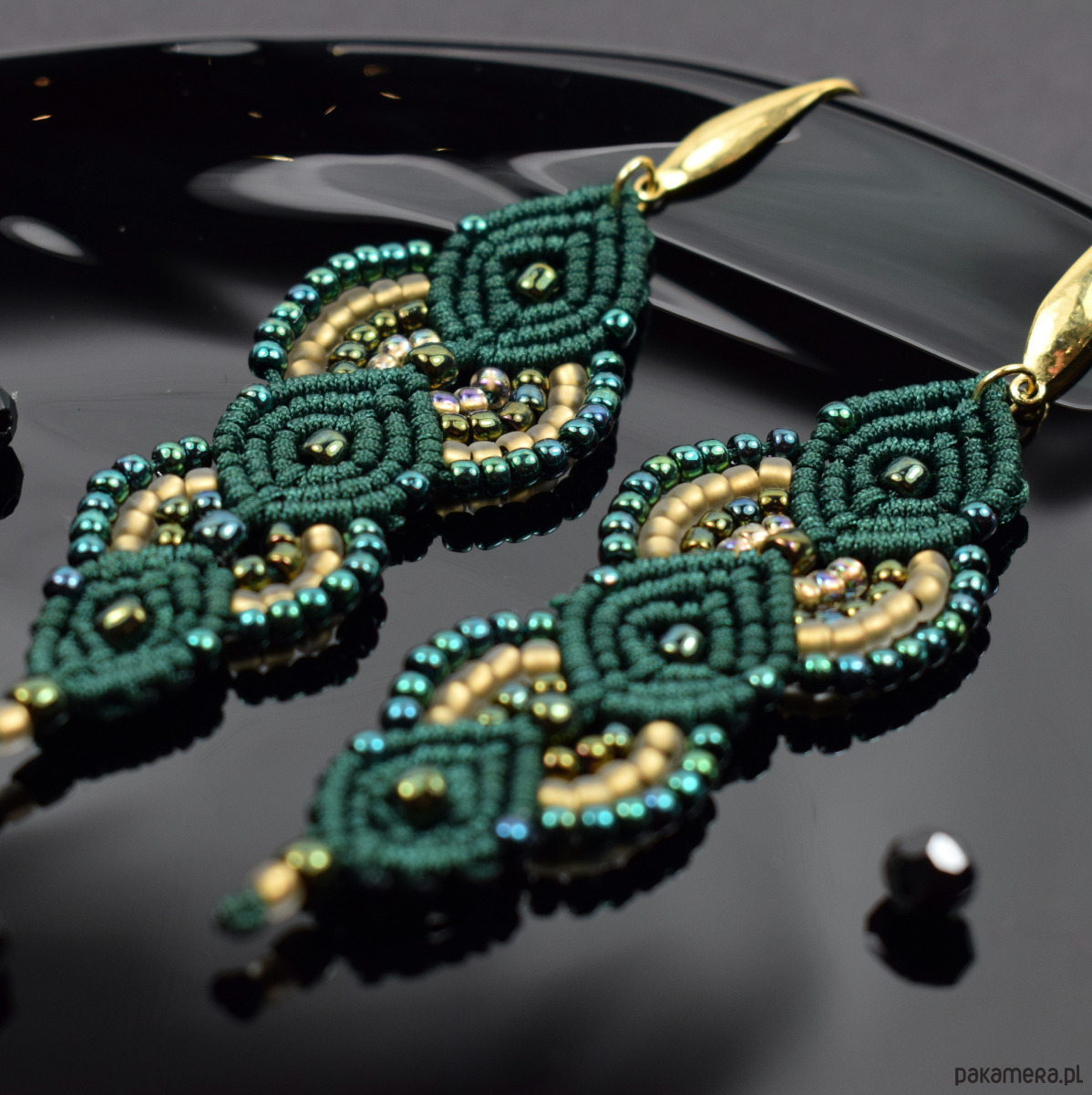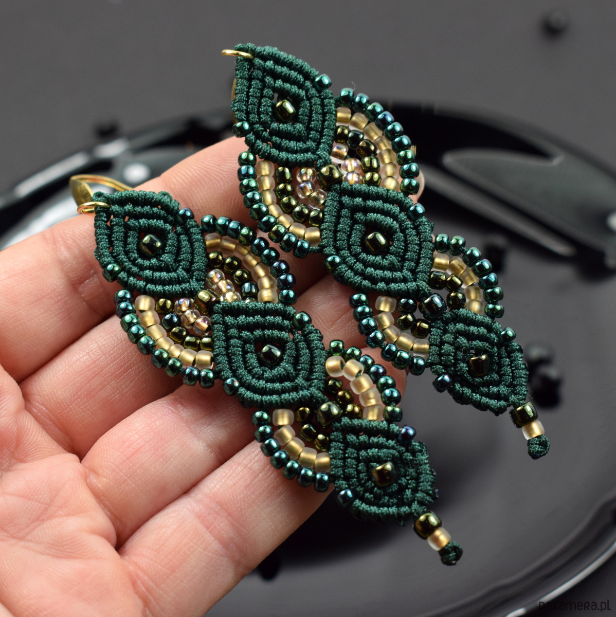 Ręcznie wykonane kolczyki stworzone techniką makramy z profesjonalnego sznurka w głębokim, butelkowym odcieniu zieleni. Ozdobione drobnymi koralikami w tonacjach złota, szmaragdu i zieleni, które pięknie odbijają światło, nadając im subtelnego blasku i elegancji.