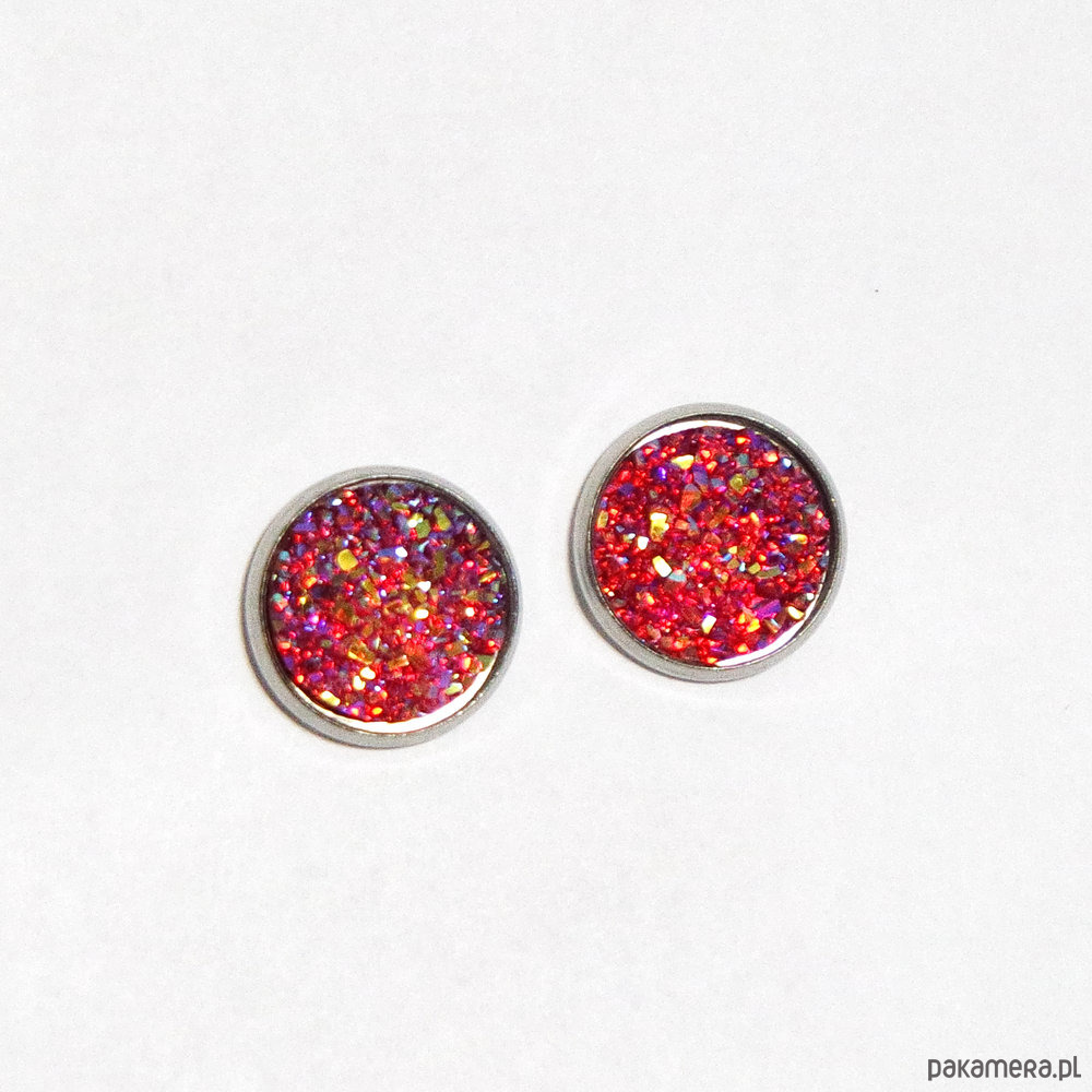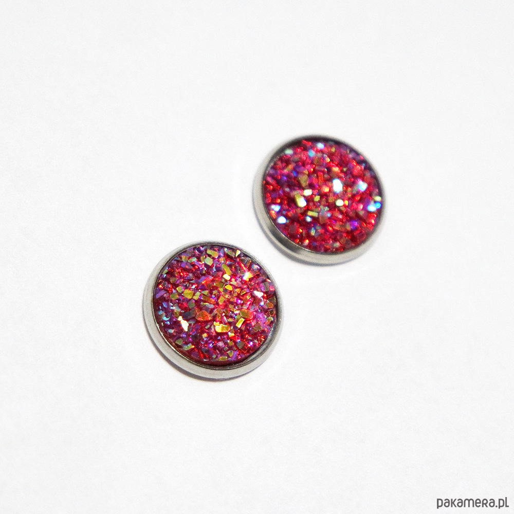 Oryginalne kolczyki z kaboszonem z żywicy - druzy, mieniący się w odcieniach czerwonym, różowym i złotym.