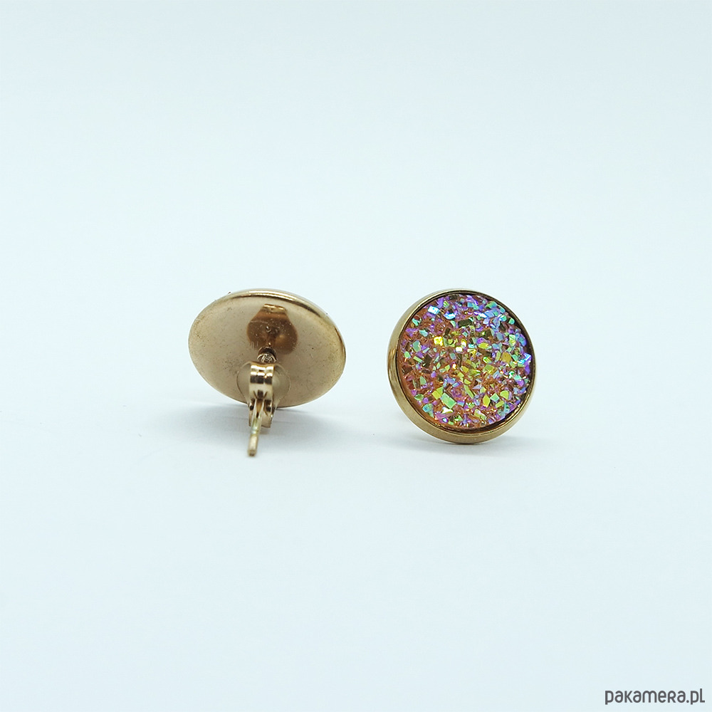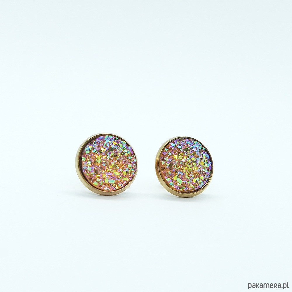 Oryginalne kolczyki z kaboszonem z żywicy - druzy, mieniący się w odcieniach łososiowym, różowym i złotym.