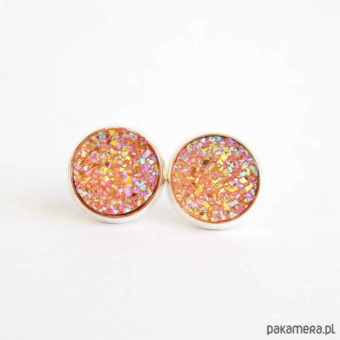 Oryginalne kolczyki z kaboszonem z żywicy - druzy, mieniący się w odcieniach łososiowym, różowym i złotym.