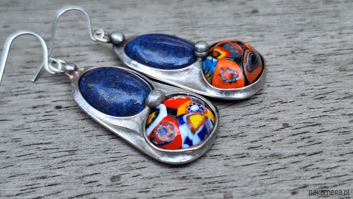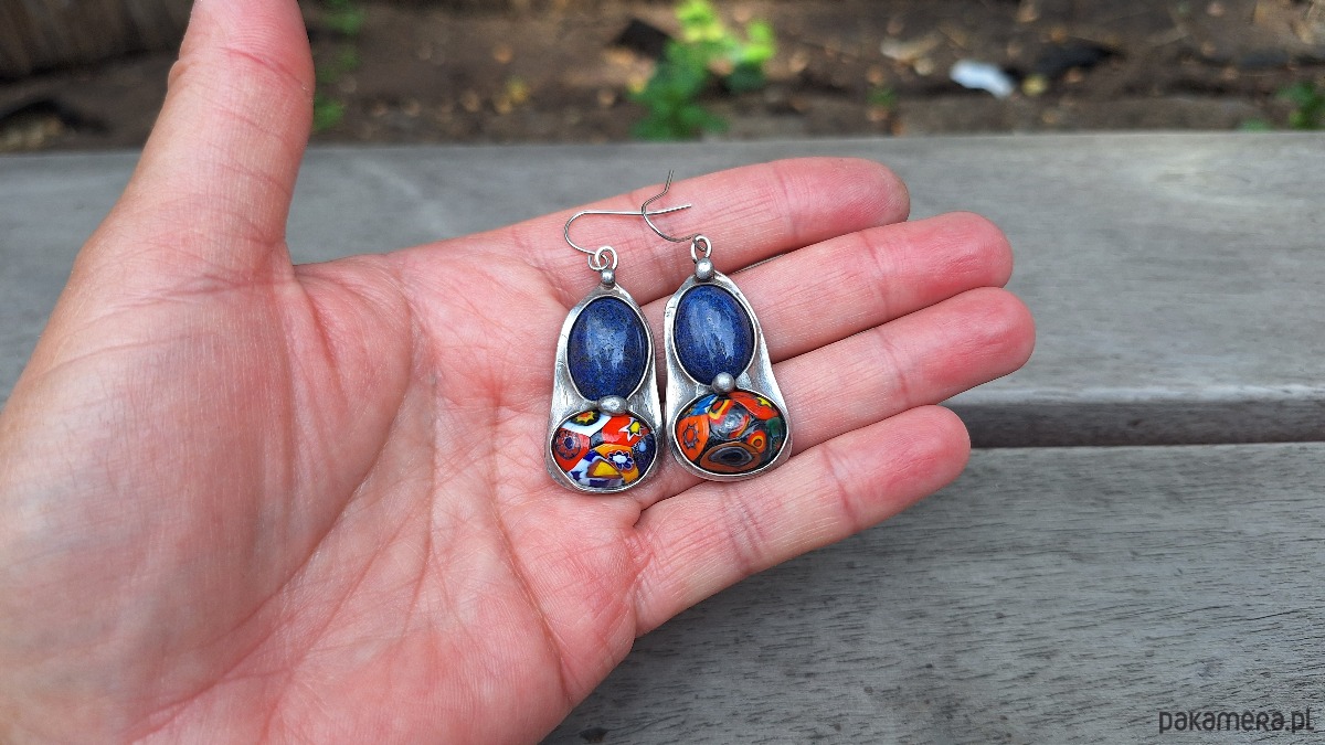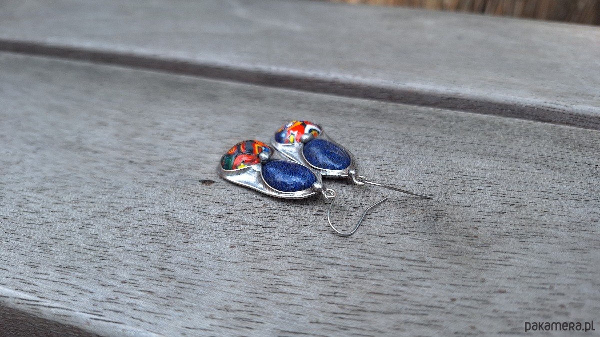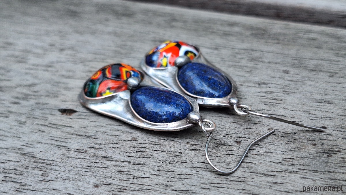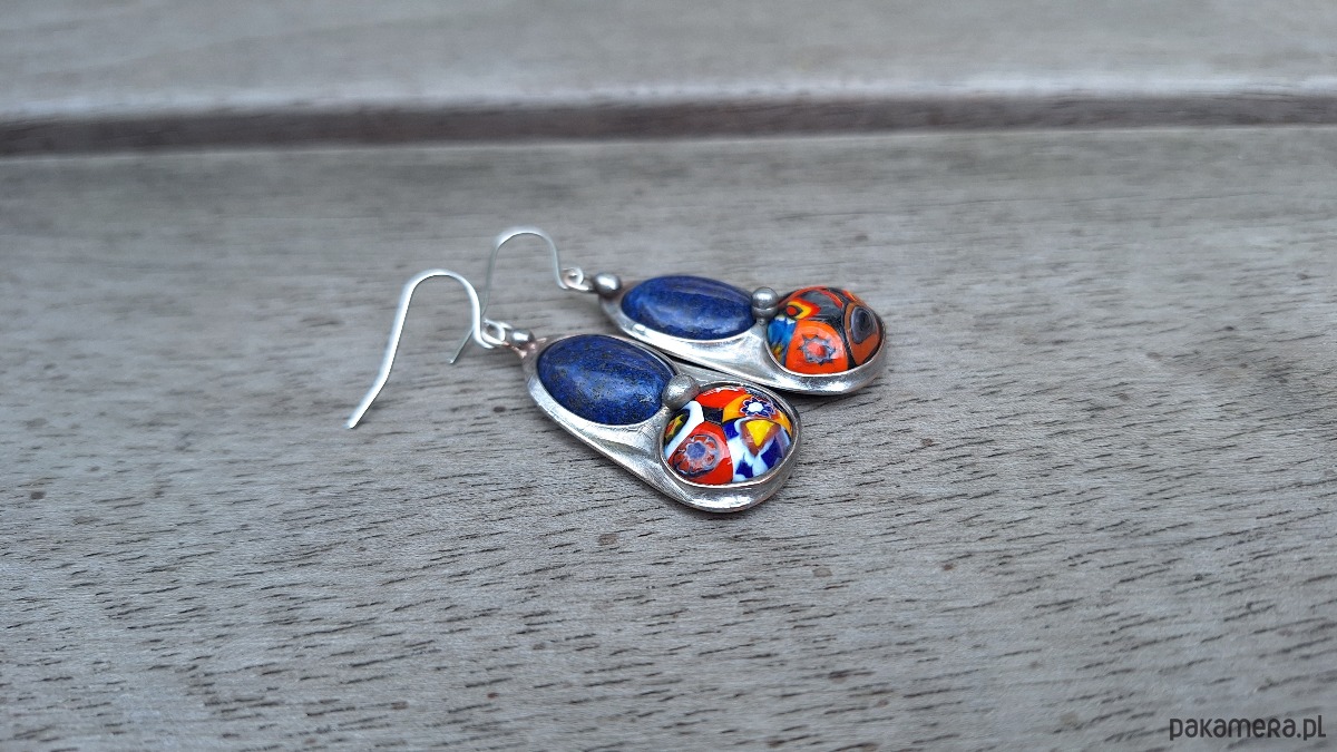 Kolczyki wykonane z miedzi, cyny, lapis lazuli i oryginalnego szkła vintage millefiori z Włoch. Długość z biglem ok. 5 cm, szerokość ok. 1.5 cm. Bigle metalowe.