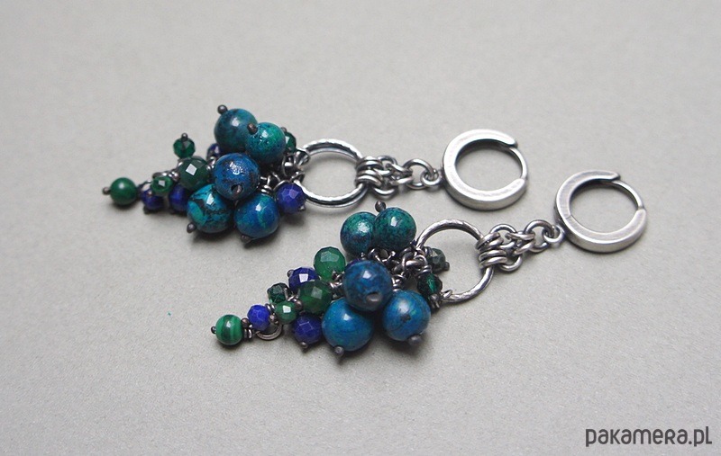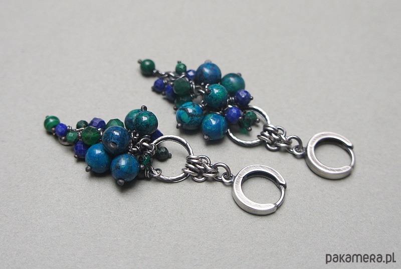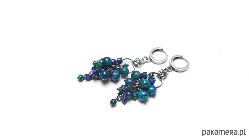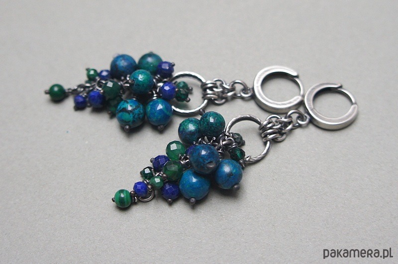 Kolczyki wykonane ze srebra [pr. 925] w połączeniu z kuleczkami chryzokoli [6mm], zielonych onyksów [4mm], fasetowanych lapisów lazuli [4mm i 3mm], malachitów [4mm i 3mm], szmaragdów [3mm - klarowane]. Całość oksydowana i przetarta. Całkowita długość kolczyków 6,2cm. Biżuteria ozdobnie zapakowana.