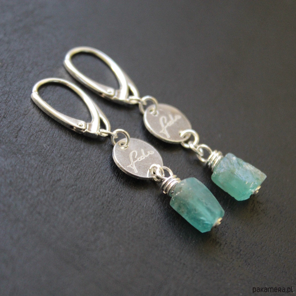 Oryginalne kolczyki wykonane zostały ze srebra próby 925 oraz surowych bryłek apatytów wielkości 0,8 cm.