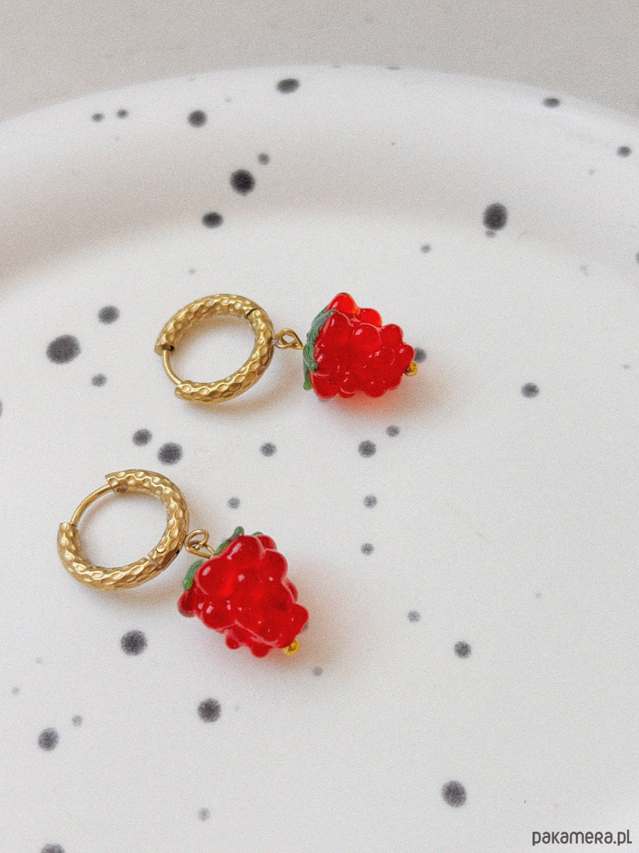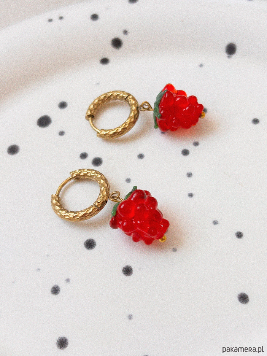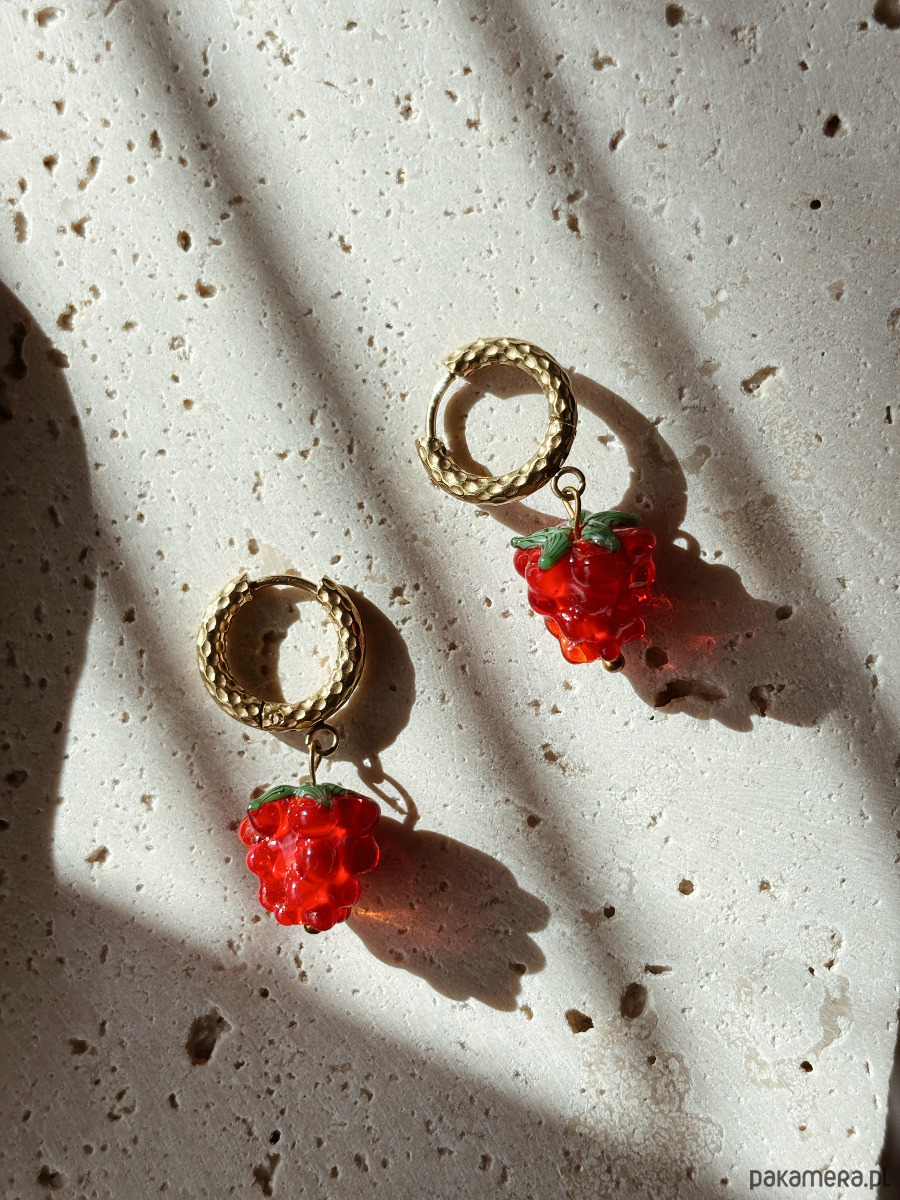 Kolczyki owoce, kolczyki z malinami, kolczyki szklane, owocowa biżuteria