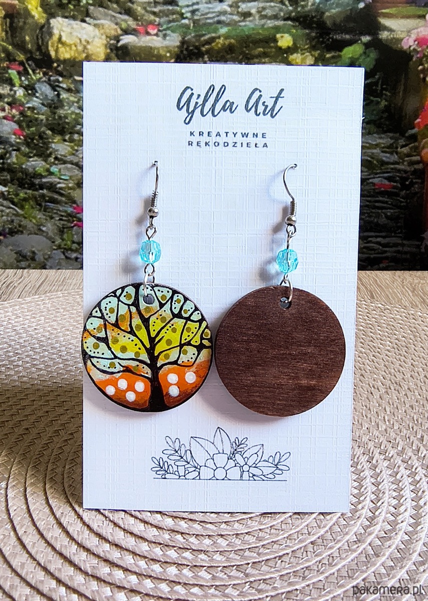 Lekkie kolczyki drewniane ręcznie malowane farbami akrylowymi z motywem drzewa.