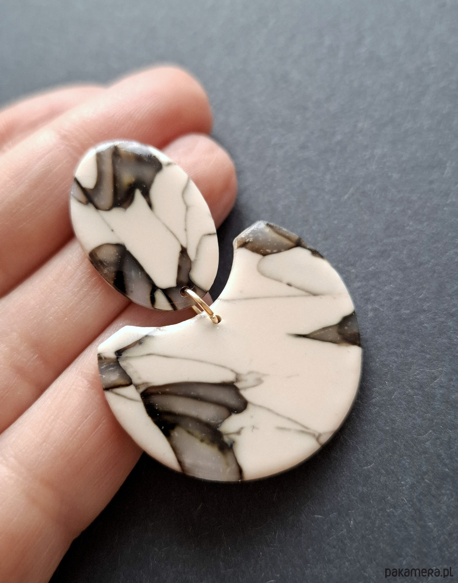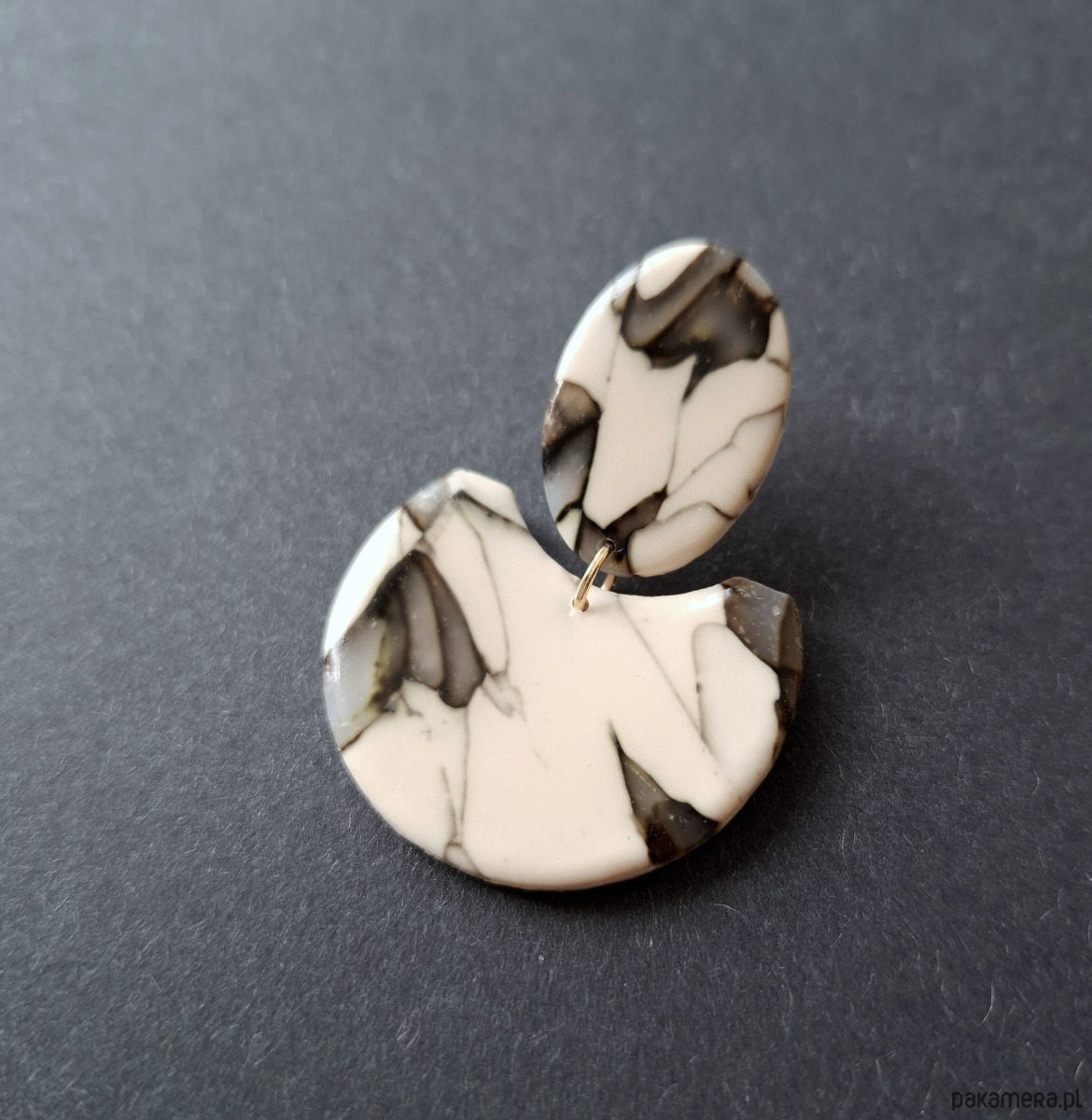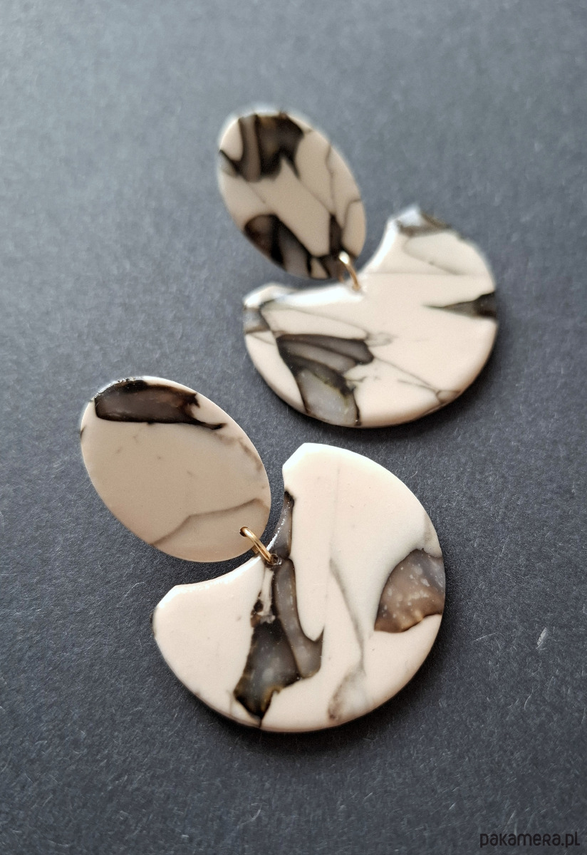Lekkie kolczyki na sztyfty wykonane z wysokiej jakości glinki polimerowej z efektem półprzezroczystości. Jednostronne z pozłacanymi, nieuczulającymi sztyftami. Wymiary: długość wraz z zapięciem: 4,7 cm; szerokość max. 3,5 cm. Wykonane w jedynym egzemplarzu.