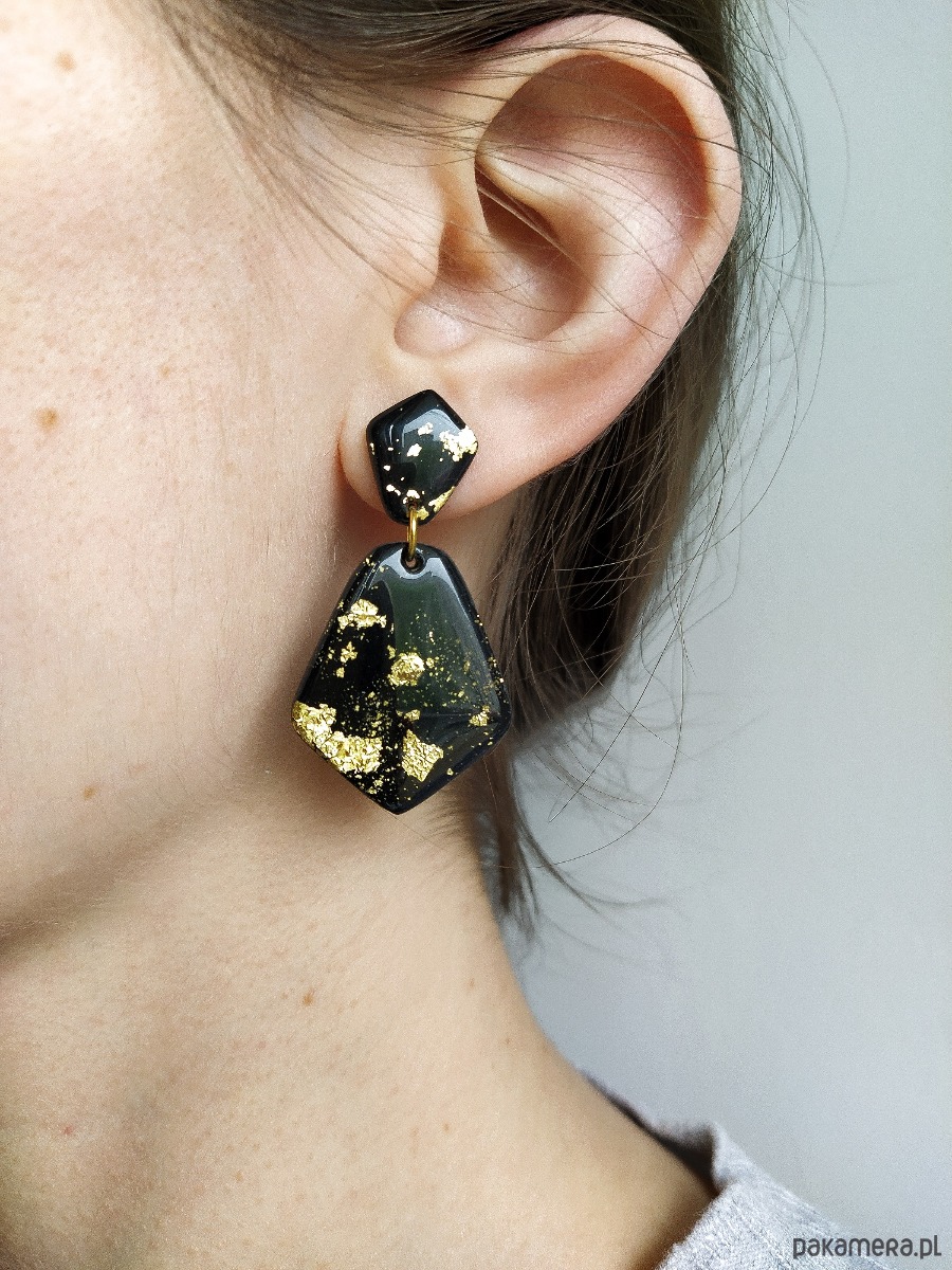 Czarne eleganckie wiszące kolczyki ze złoceniami