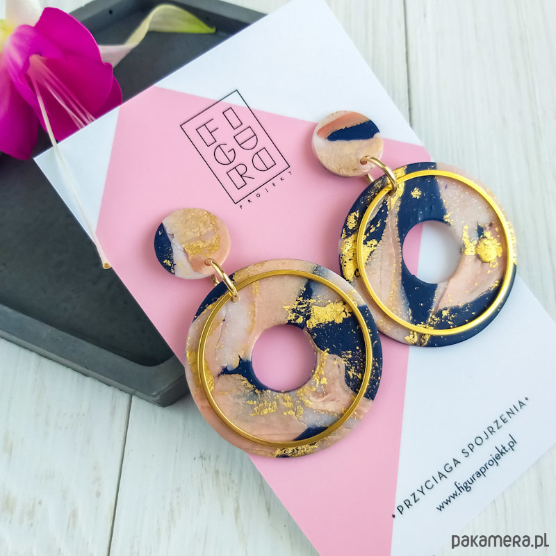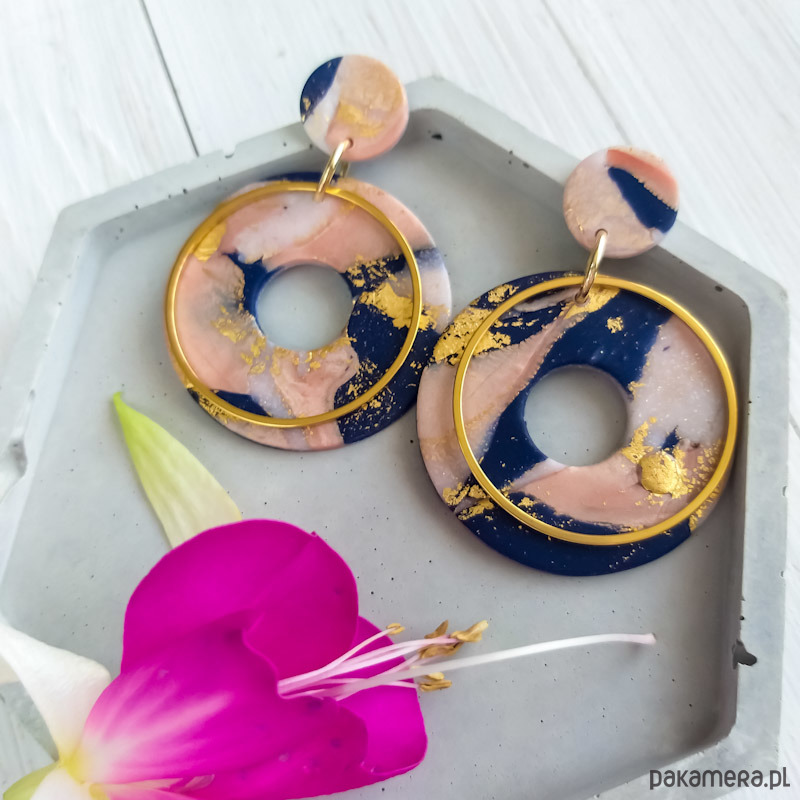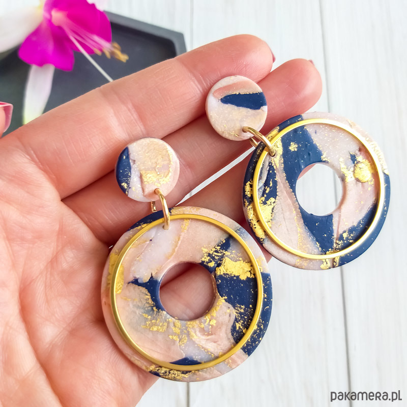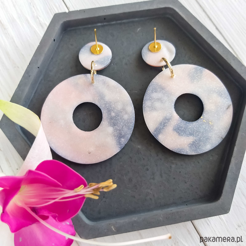 Lekkie, ręcznie wykonane kolczyki z glinki polimerowej. Połączone z antyalergicznymi elementami metalowymi. Zapinane na baranek metalowy.