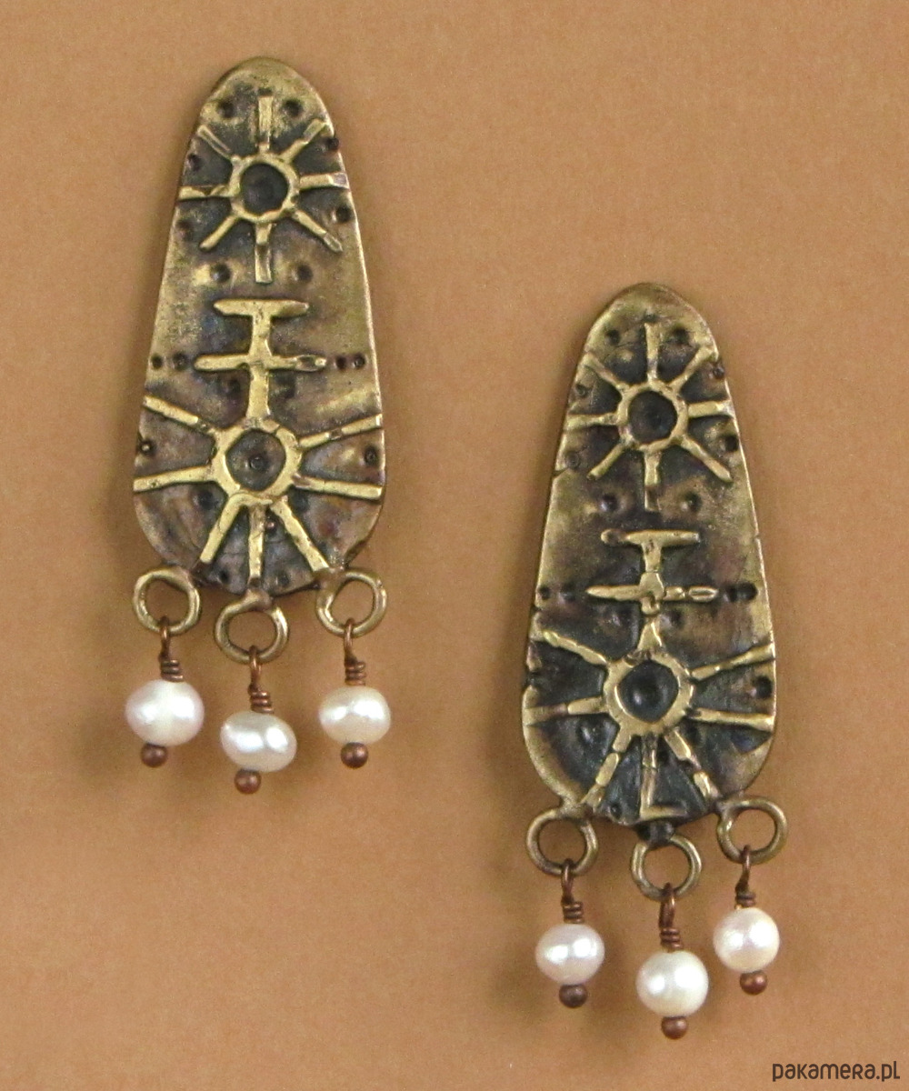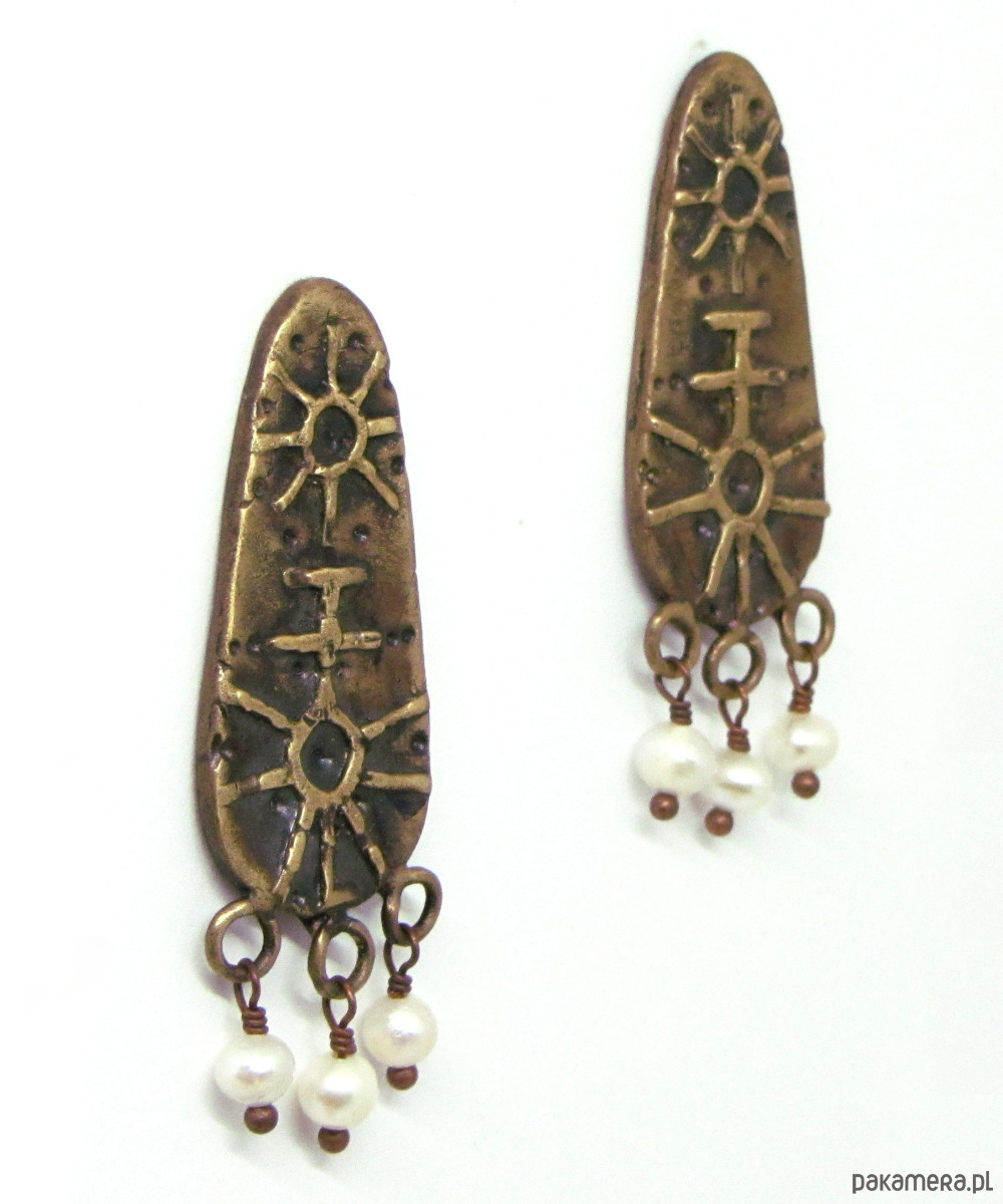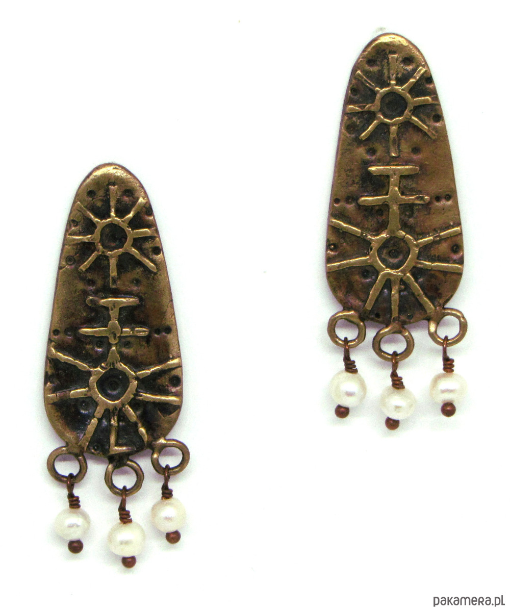 Antyczne kolczyki inspirowane epoką brązu z graficznymi przedstawieniami słońc oraz perłami. Elementy centralne zostały wykonane z brązu w krakowskiej pracowni.