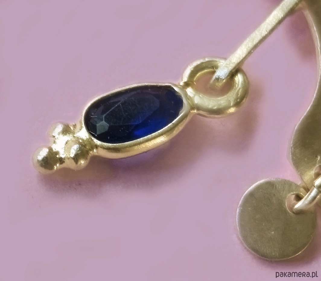 Ta para ręcznie wykonanych kolczyków łączy elegancję z rzemieślniczym charakterem. Każdy element został starannie wykonany z wysokiej jakości srebra próby 925 i mosiądzu pokrytego 24-karatowym złotem. Ozdobiony jest naturalnymi, fasetowanymi szafirami w głębokim, granatowym odcieniu.
