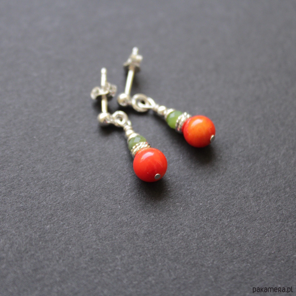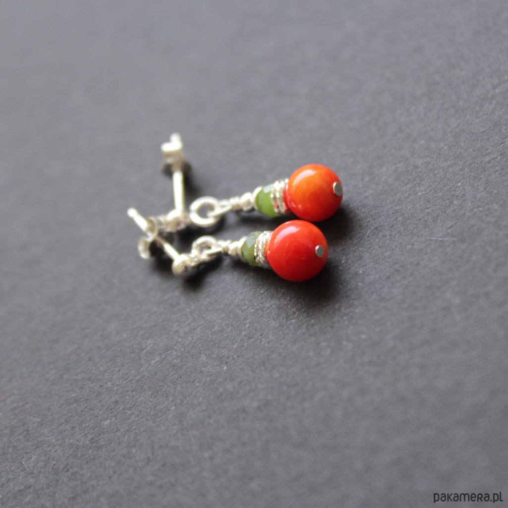 Kolorowe kolczyki wykonane zostały ze srebra próby 925 oraz pomarańczowego korala (0,6 cm) wtowarzystwiefasetowanego nefrytu (0,35 cm).