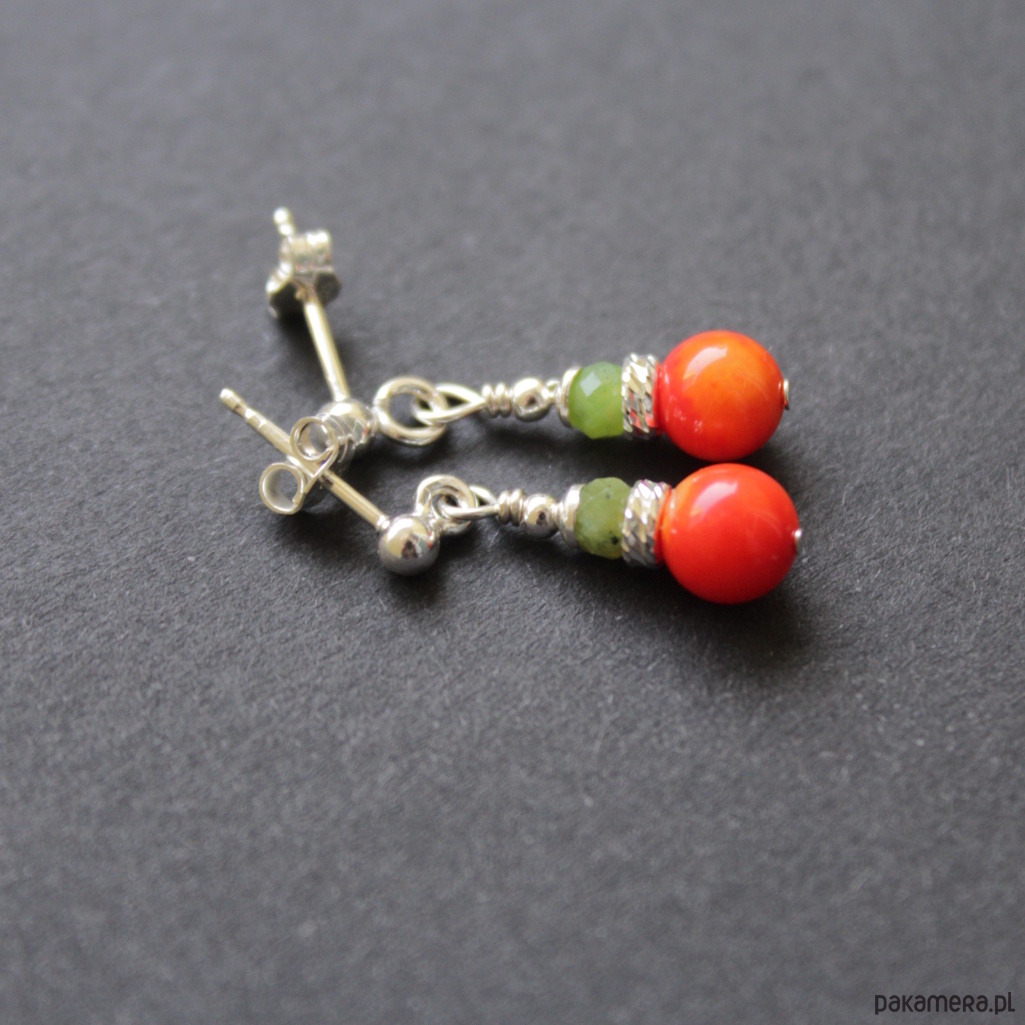Kolorowe kolczyki wykonane zostały ze srebra próby 925 oraz pomarańczowego korala (0,6 cm) wtowarzystwiefasetowanego nefrytu (0,35 cm).