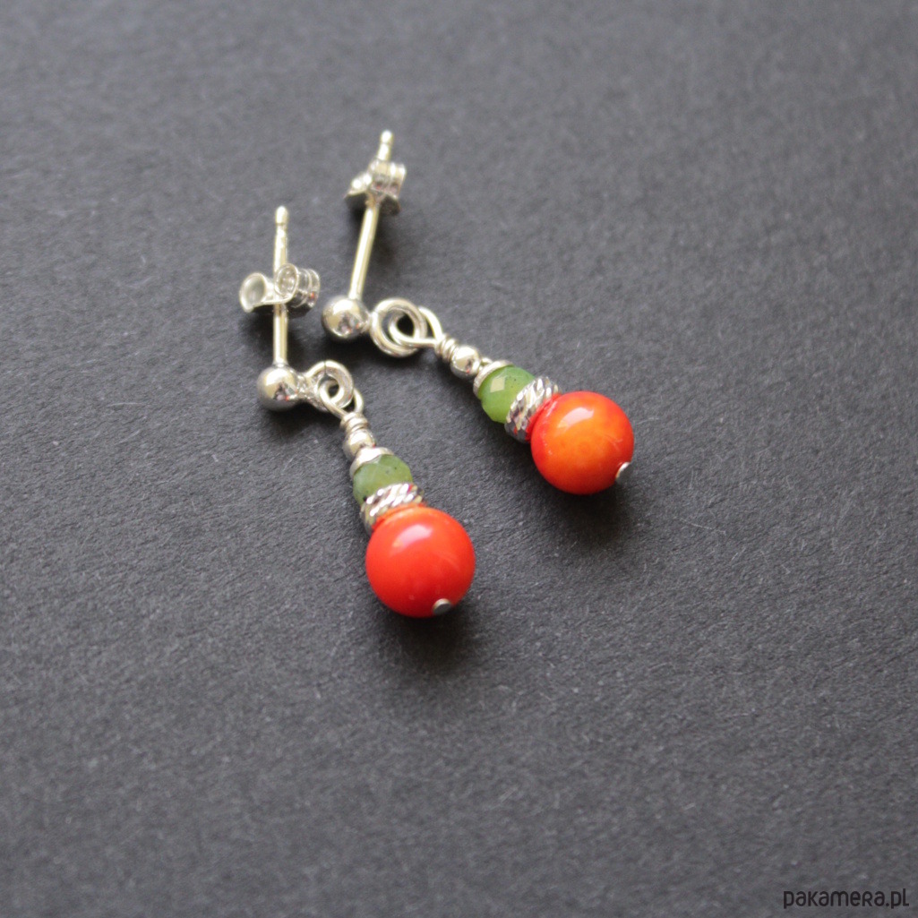 Kolorowe kolczyki wykonane zostały ze srebra próby 925 oraz pomarańczowego korala (0,6 cm) wtowarzystwiefasetowanego nefrytu (0,35 cm).