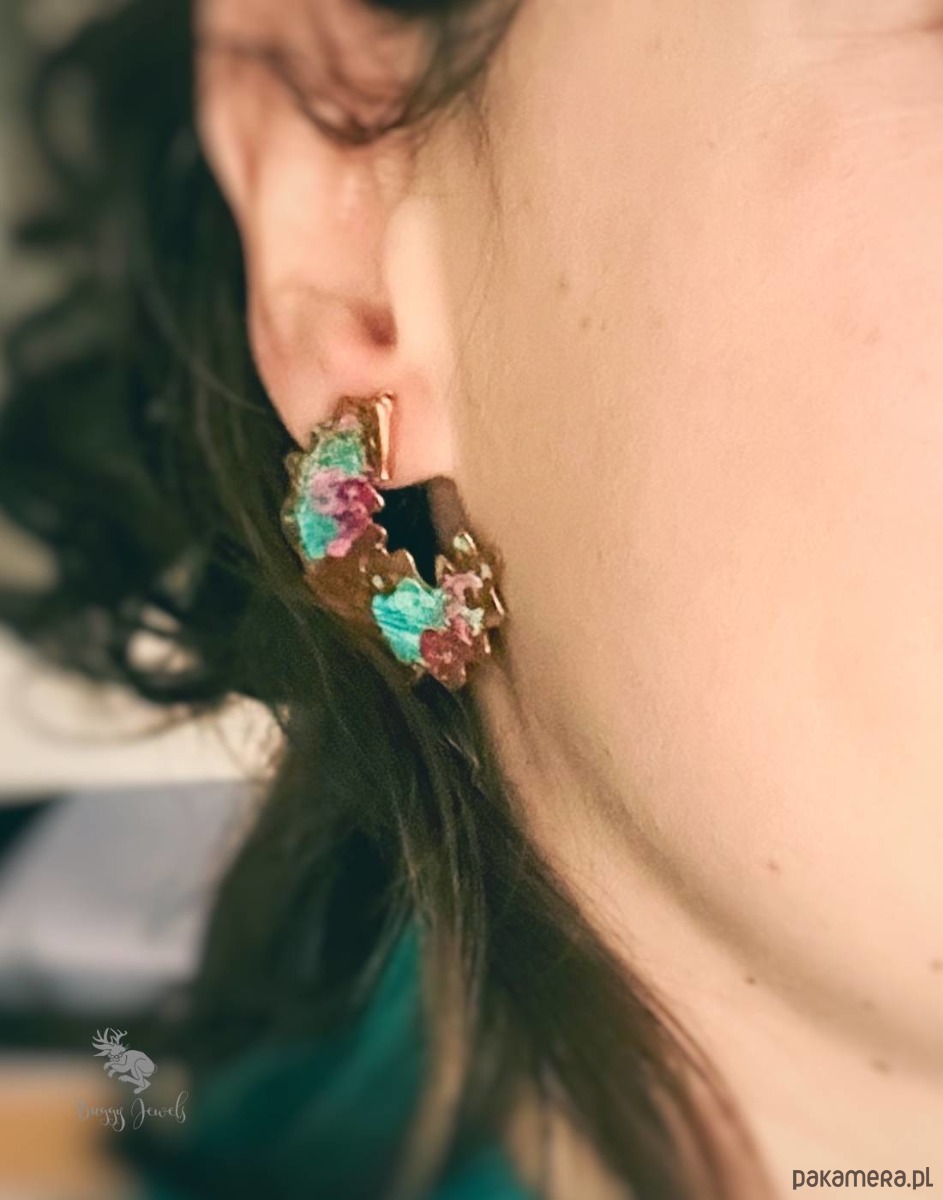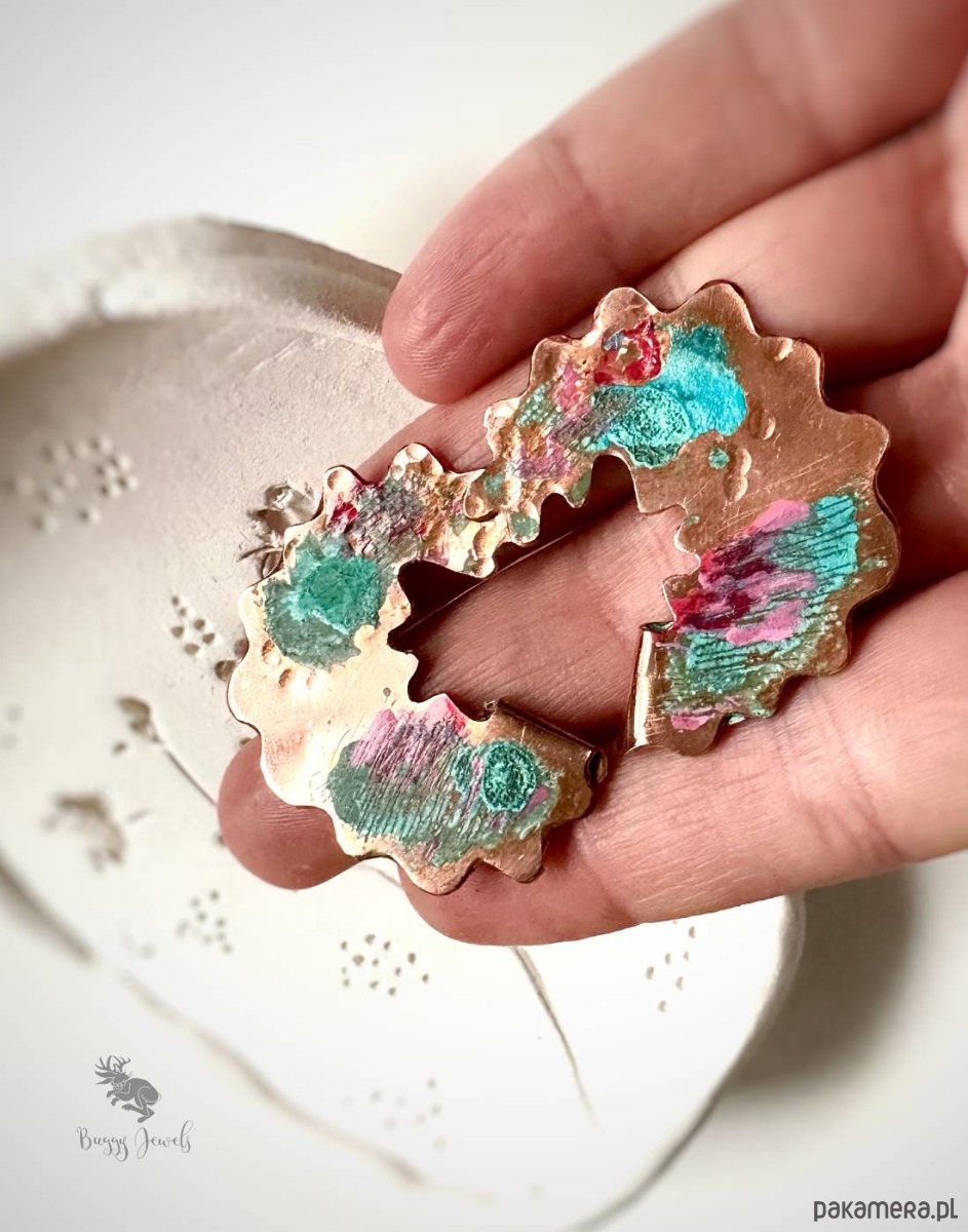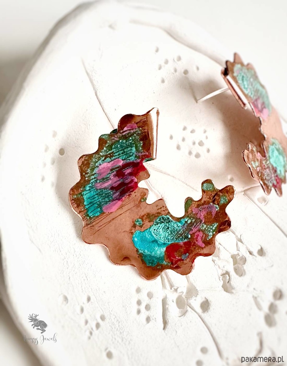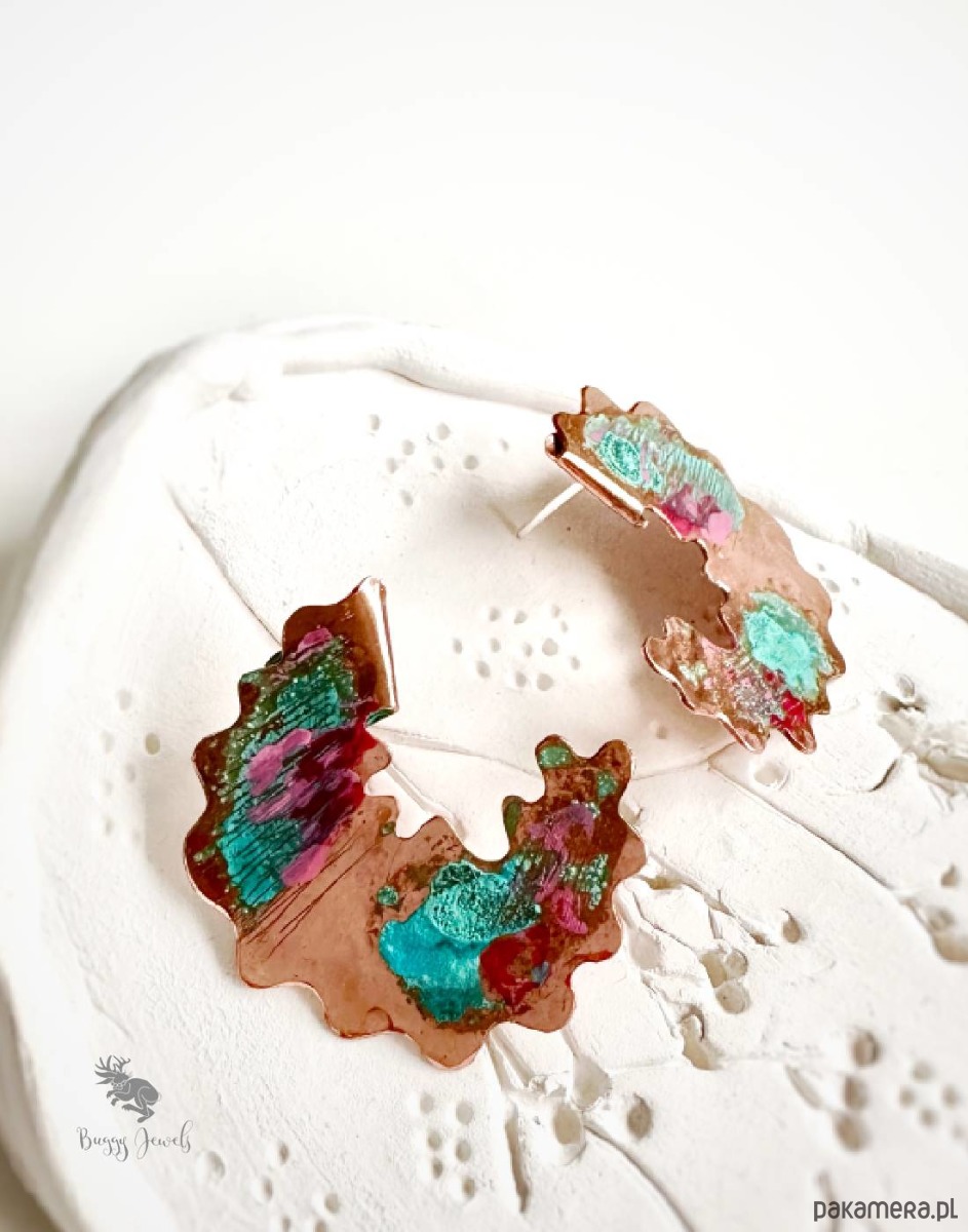 Kolczyki wykonane z miedzi, patynowanei artystycznie malowane. Kolczyki są dodatkowo delikatnie lakierowane, dla zapewnienia trwałośc .