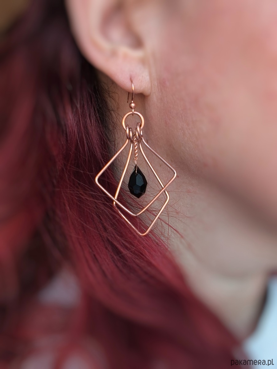 Delikatne, otwarte formy z miedzianego drutu tworzą przestrzenną kompozycję, która pięknie pracuje w ruchu. W centrum zawieszony jest czarny kryształek Preciosa, łapiący blask przy każdym kroku i dodający całości eleganckiej lekkości. To detal, który nie dominuje, ale subtelnie dopełnia formę.