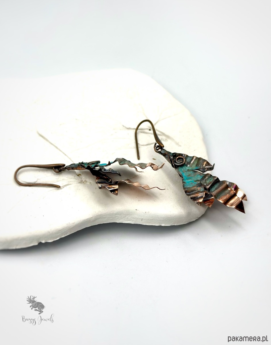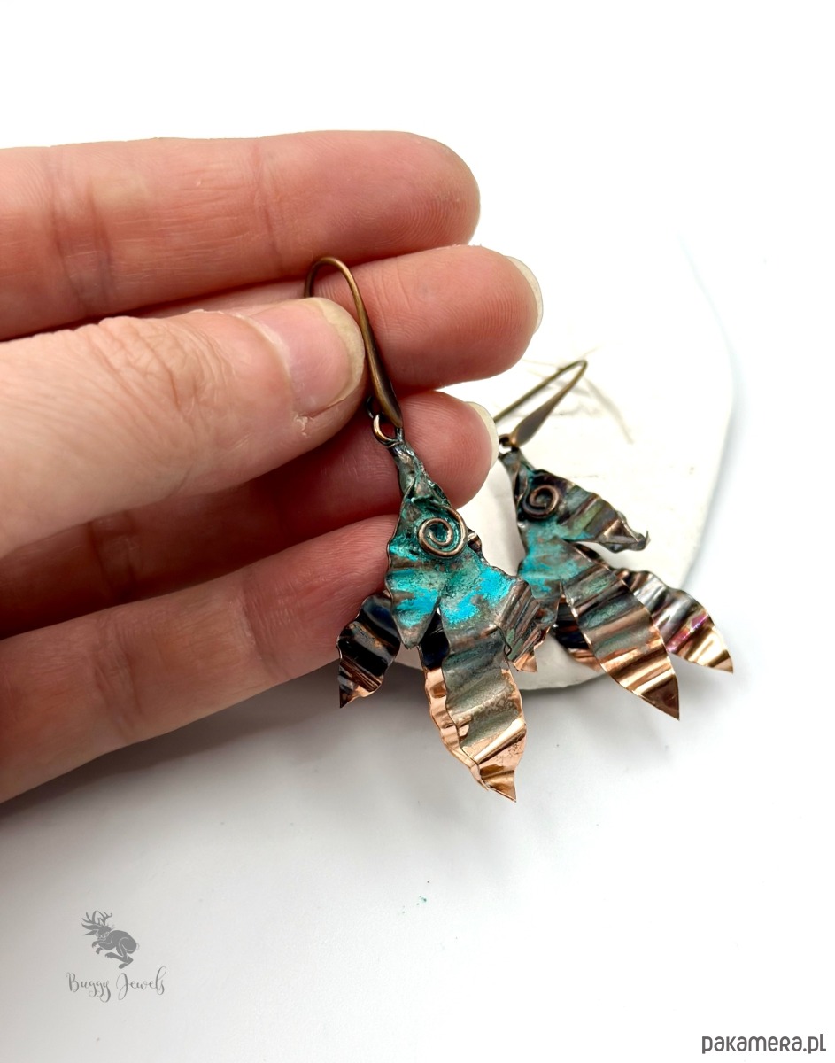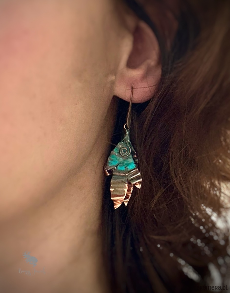 Lekkie kolczyki miedziane zostały poczernione, a następnie wypolerowane i pokryte turkusową patyną. Całość została delikatnie polakierowana, dla utrzymania efektu.