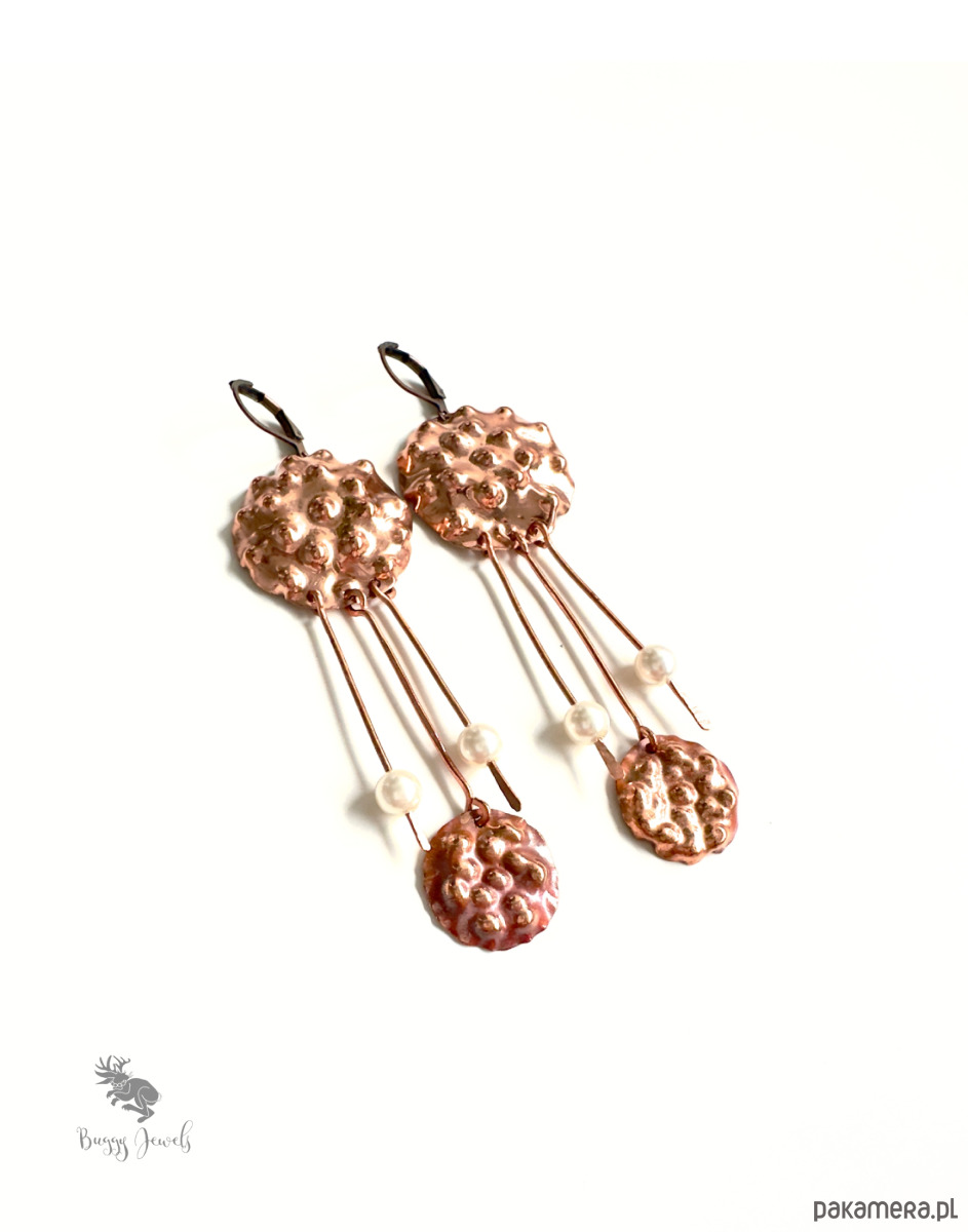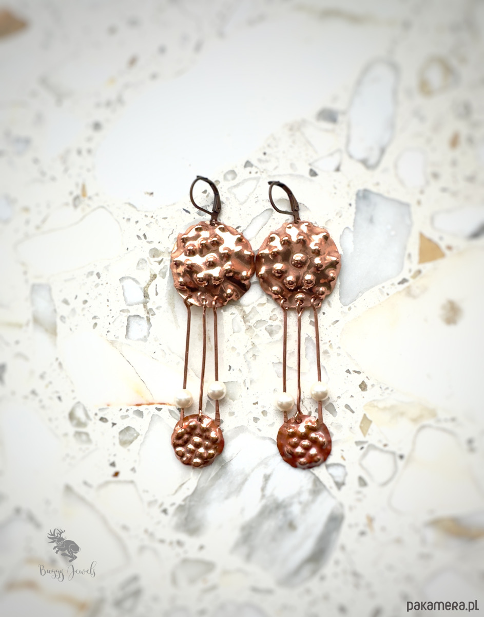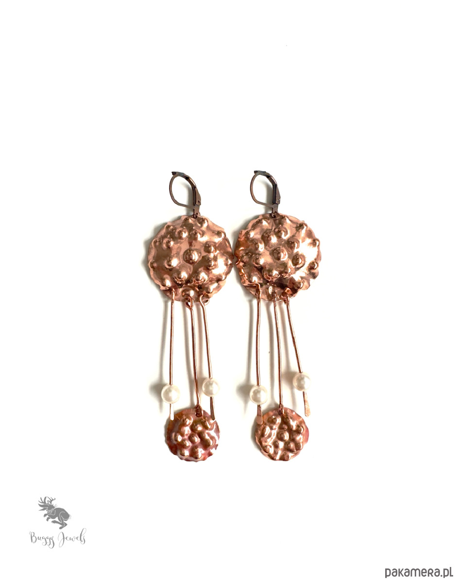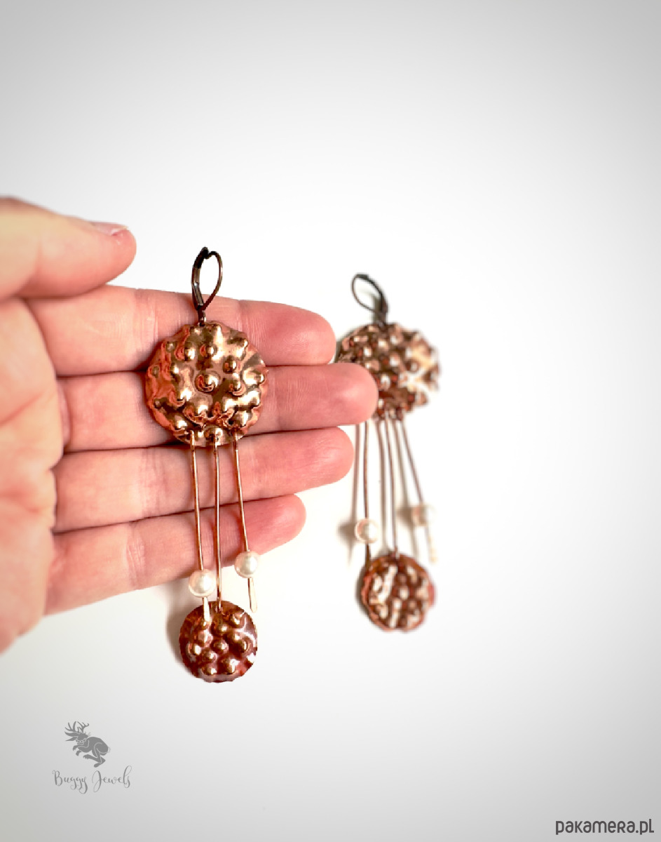 Kolczyki są wykonane całkowicie ręcznie metodą repusowania i młotkowania. Na końcach znajdują się małe perełki.