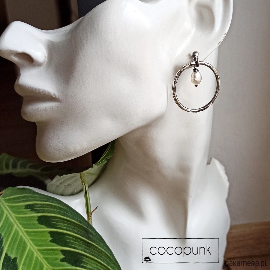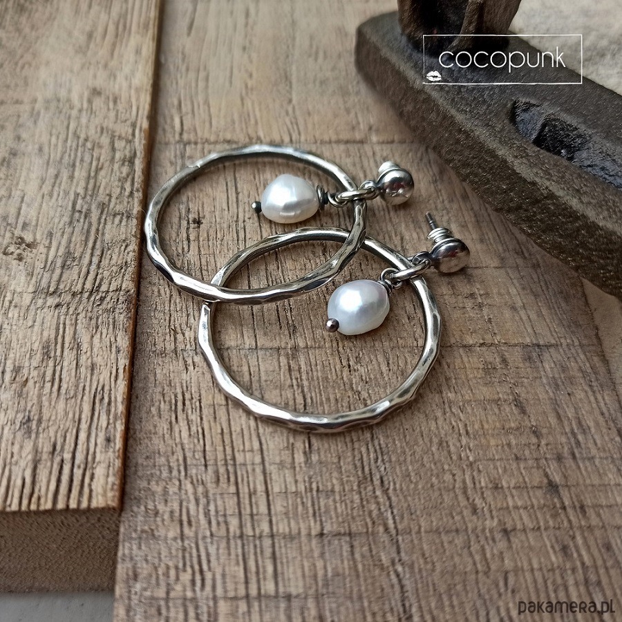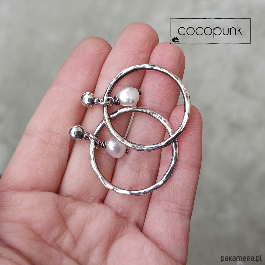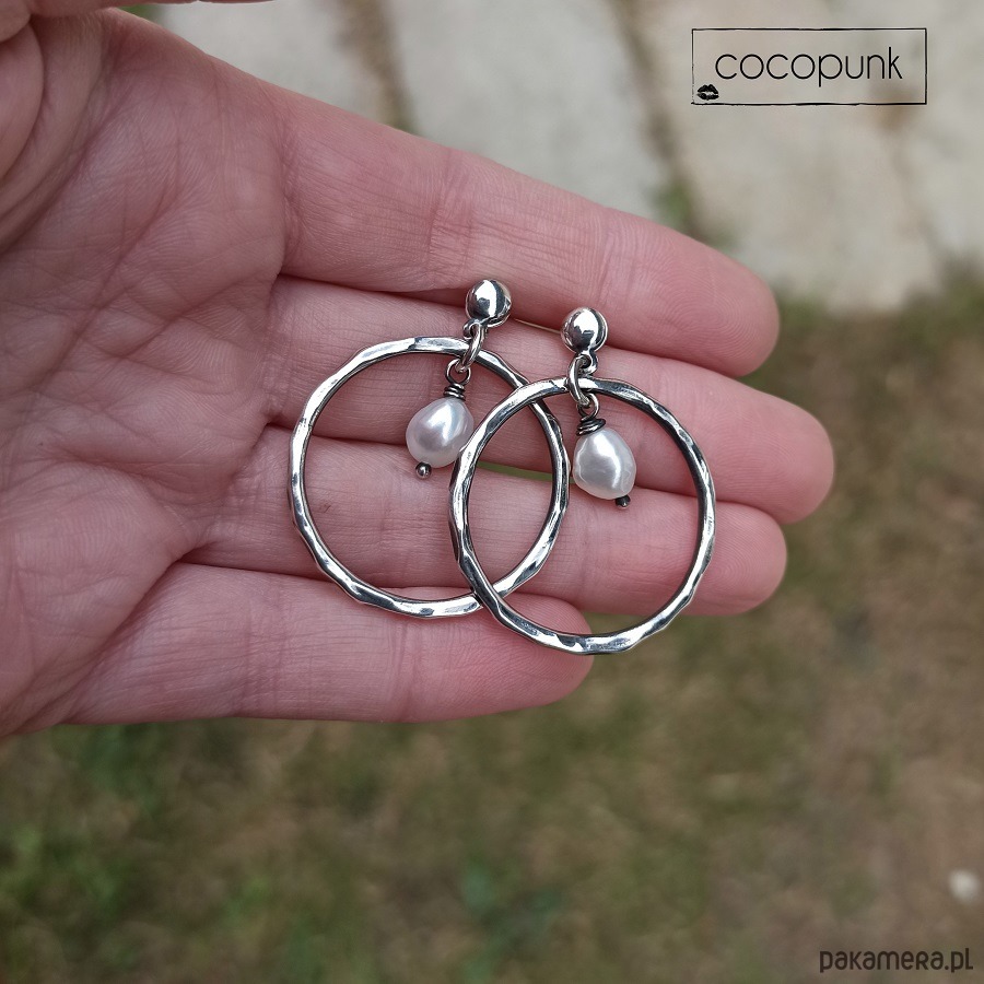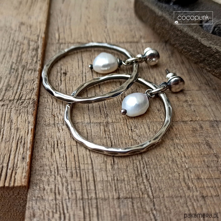Kolczyki wykonane są w 100% ze srebra pr. 925 (przyciemnianego i polerownego), w tym ręcznie kutych, młotkowanych kół o średnicy 3 cm. Dodatkowo zdobią je nieregularne białe perły wielkości ok. 0,7cm. Długość całkowita kolczyków, mierzona od szczytu sztyftów, wynosi 3,8 cm. Zaletą jest także ich lekkość - waga jednego kolczyka- 2,6 grama. Gorąco polecam. W ofercie posiadam bransoletki i naszyjniki do kompletu. Biżuteria dotrze do Państwa elegancko zapakowana.