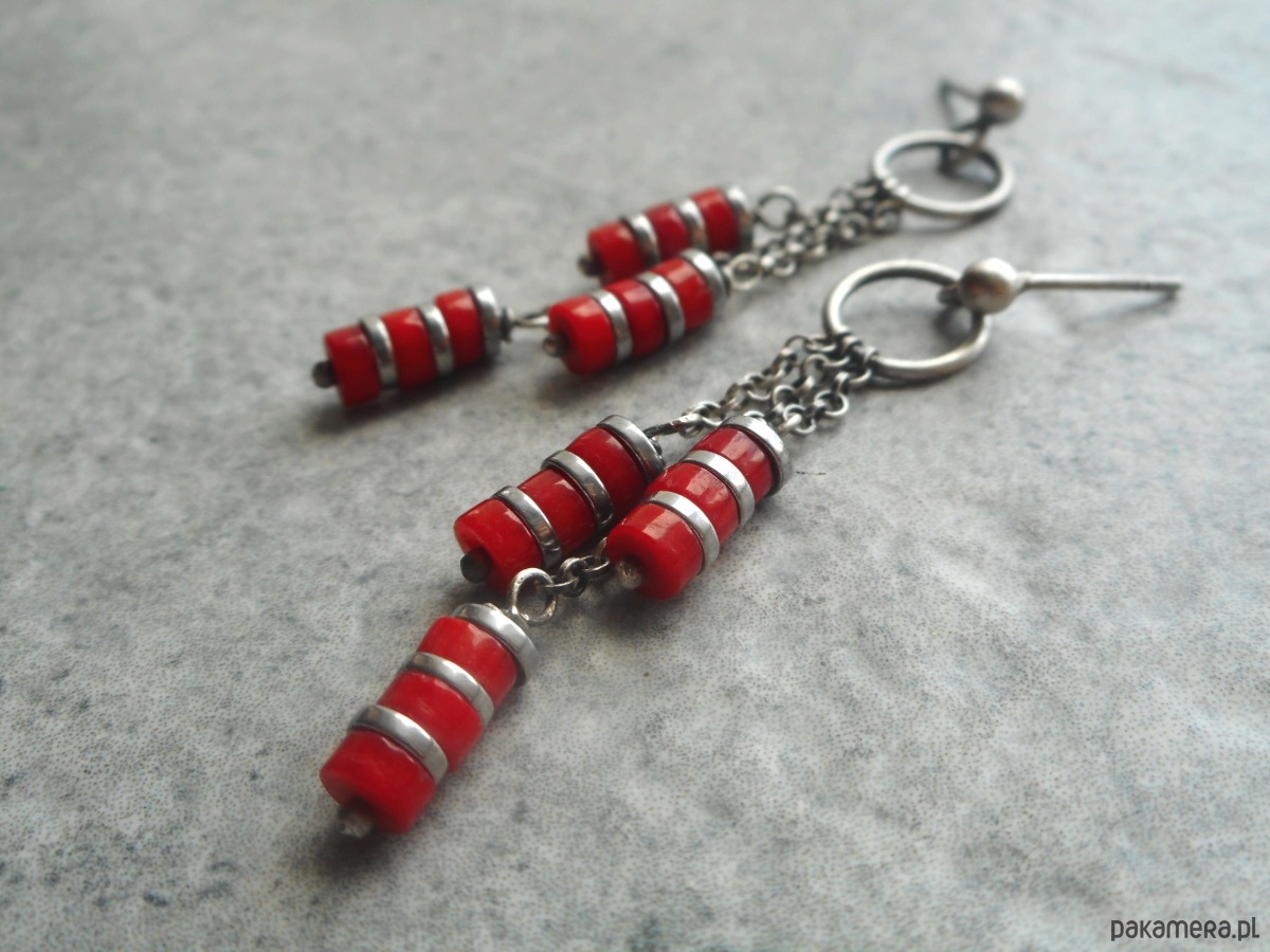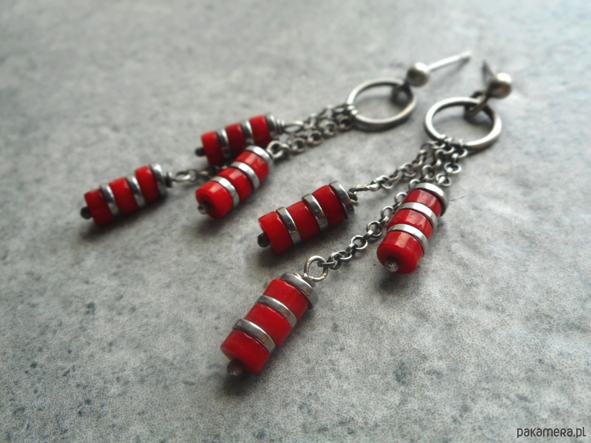 Delikatne, zwiewne kolczyki wykonane zostały z oksydowanego i przetartego srebra próby 925 oraz krążków korala i hematytu wielkości 4 mm. Długość kolczyków wynosi 5 cm.