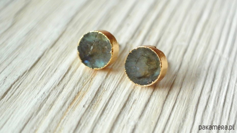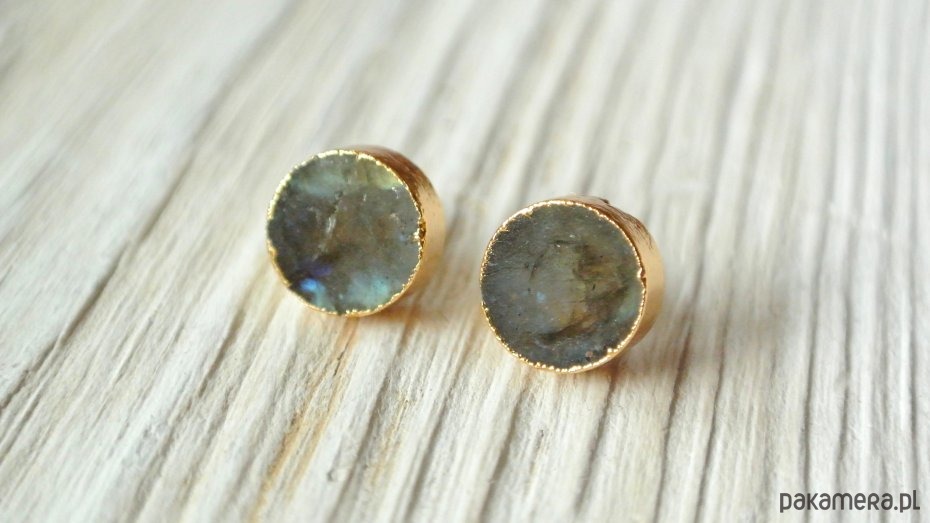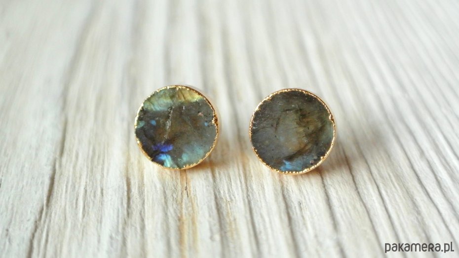 Okrągłe kolczyki na sztyftach wykonane z labradorytu w pozłacanej oprawie. Kamień mieni się pięknie różnymi odcieniami. Labradoryt uwalnia pozytywną energię, wzmacnia odwagę, intuicję, decyzyjność.