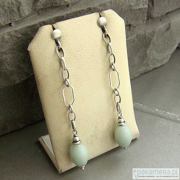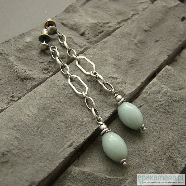 Modne, minimalistyczne i nowoczesne kolczyki wykonane w całości z oksydowanego srebra próby 925 oraz oliwek amazonitu wielkości 1,2 cm. Zapięcia typu sztyft z dobrze trzymajacymi zatyczkami. Całkowita długość kolczyków to 6,3 cm. Ozdobnie zapakowane.