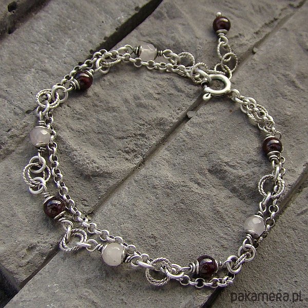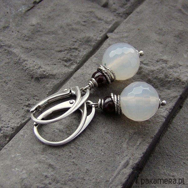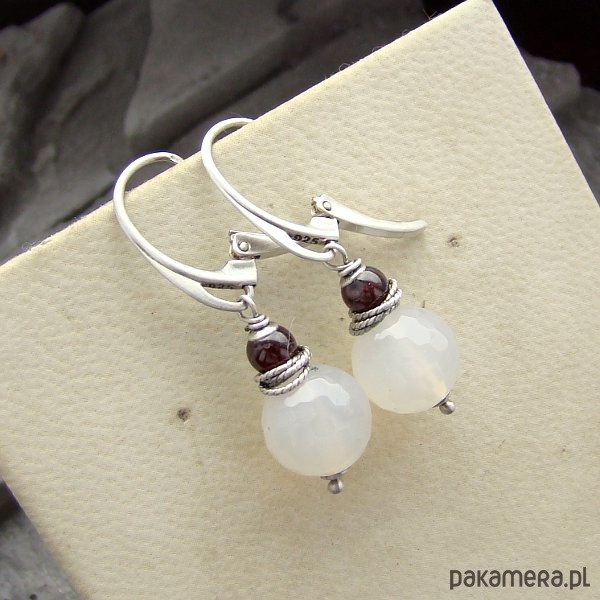 Proste i kobiece kolczyki wykonane w całości z oksydowanego srebra próby 925 oraz kulek mleczego jadeitu wielkości 1,1 cm oraz 4,5 mm kulek granatu. Bigle angielskie, samozatrzaskowe. Całkowita długość kolczyków to ok. 3,7 cm. W mojej galerii bransoletka do kompletu. Ozdobnie zapakowane.