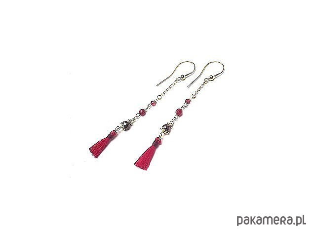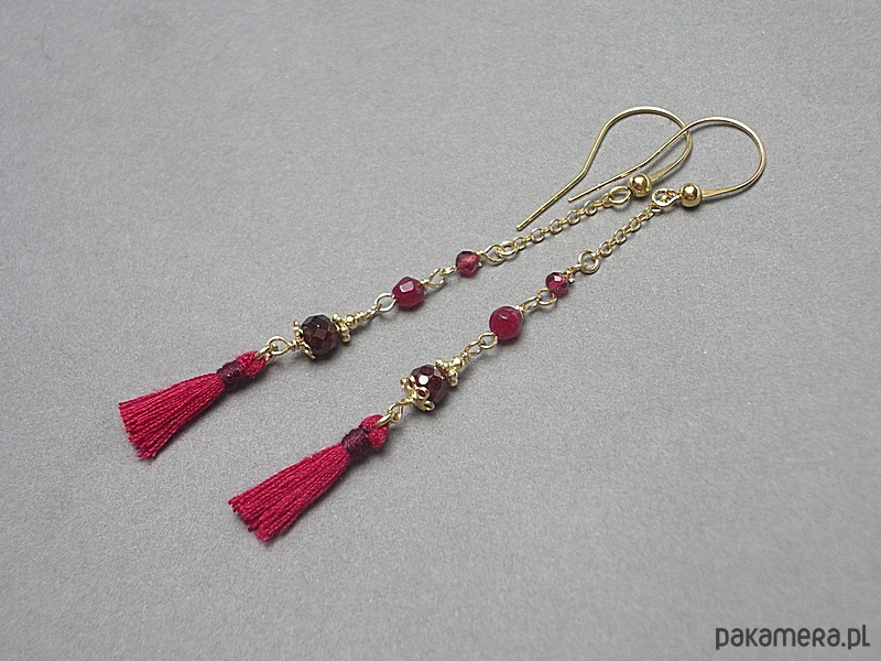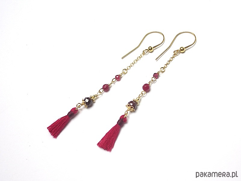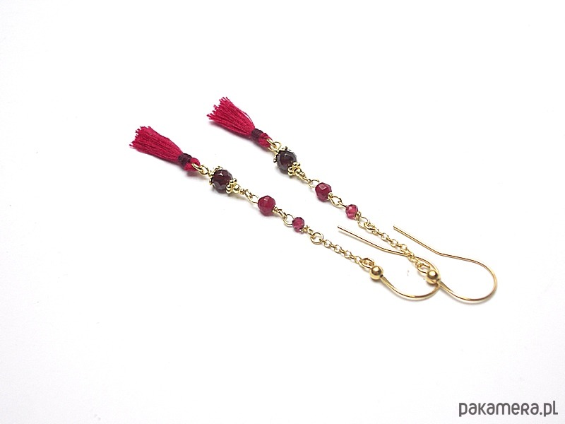 Kolczyki wykonane ze srebra pokrytego 24k złotem [pr. 925] w połączeniu z fasetowanymi rubinami [2mm - klarowane], fasetowanymi granatami [5mm], jadeitami [4mm], kryształkami Swarovski [4mm] oraz chwostami. Całkowita długość kolczyków: 8,5 cm. Biżuteria ozdobnie zapakowana.