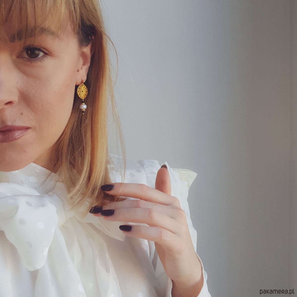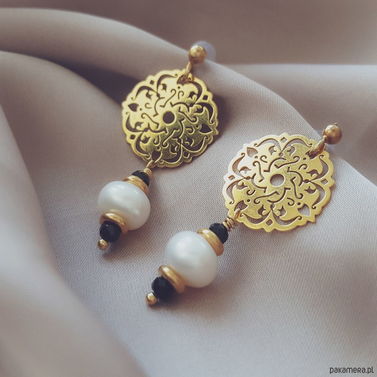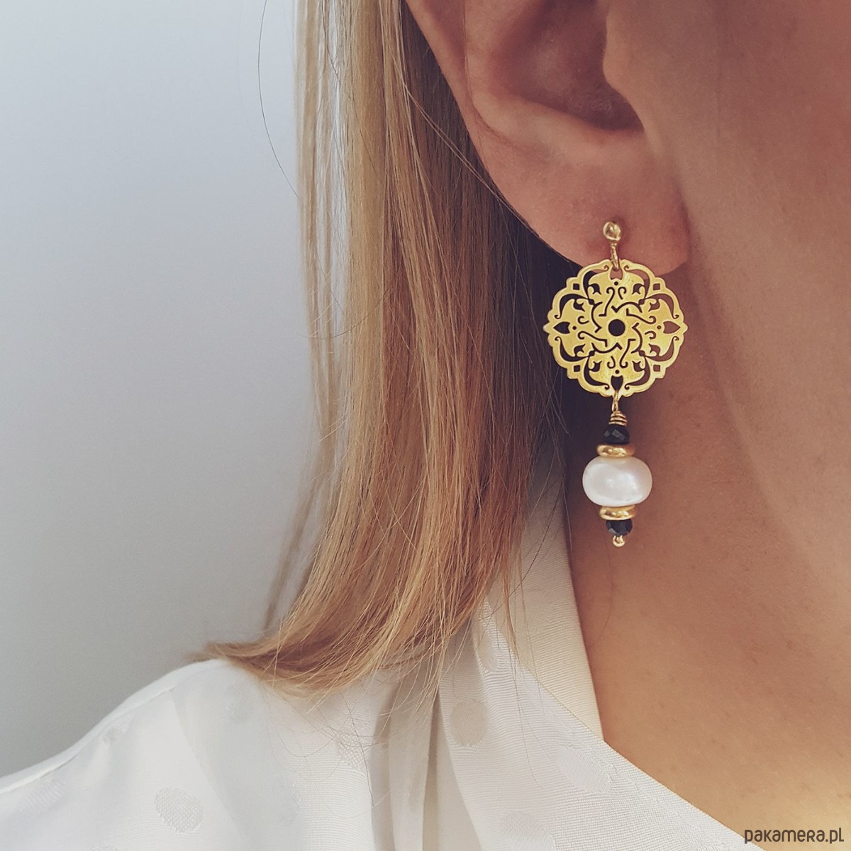 Eleganckie kolczyki z ażurową rozetą, naturalnymi perłami i czarnym spinelem. Wiszące kolczyki osadzone są na sztyftach i wykonane ze srebra pozłacanego. Pod piękną, złotą rozetę podpięte są kamienie – fasetowane spinele przeplatane złoconymi oponkami. Pomiędzy nimi, centralnie znajduje się owalna spłaszczona perła słodkowodna w kolorze białym. Kolczyki są lekkie i bardzo wygodnie się noszą. W zestawie znajdują się srebrne baranki.