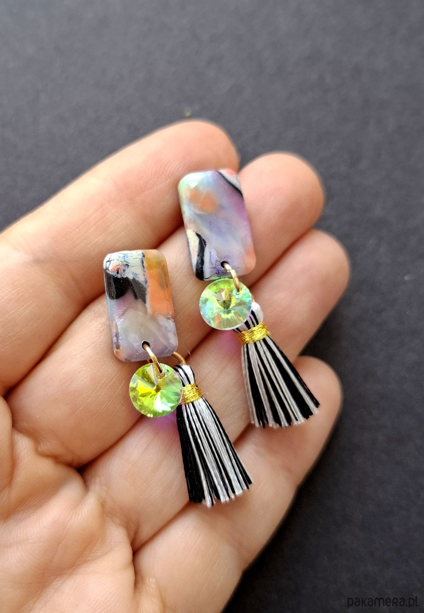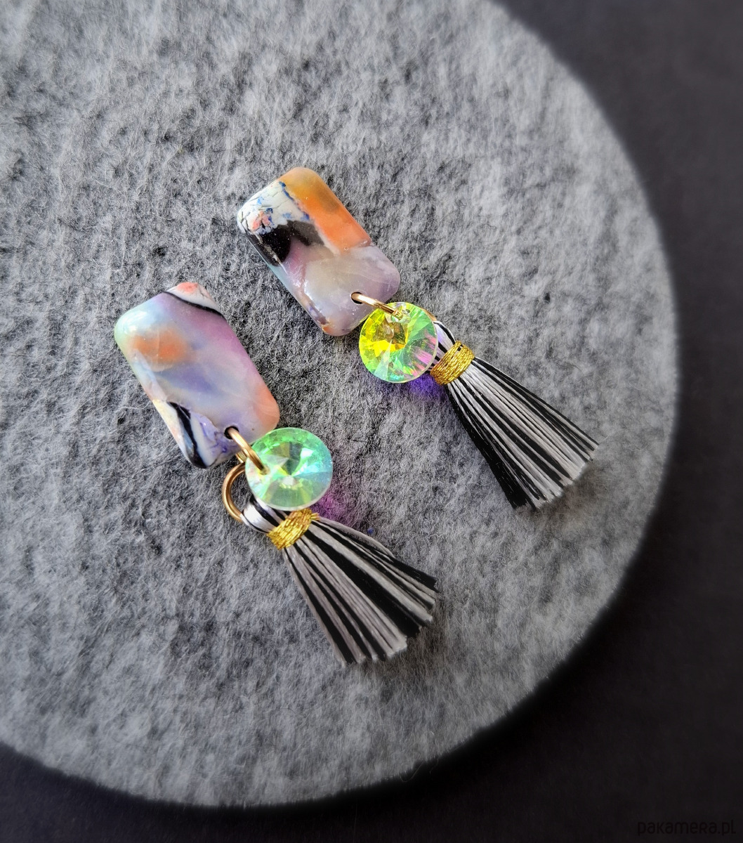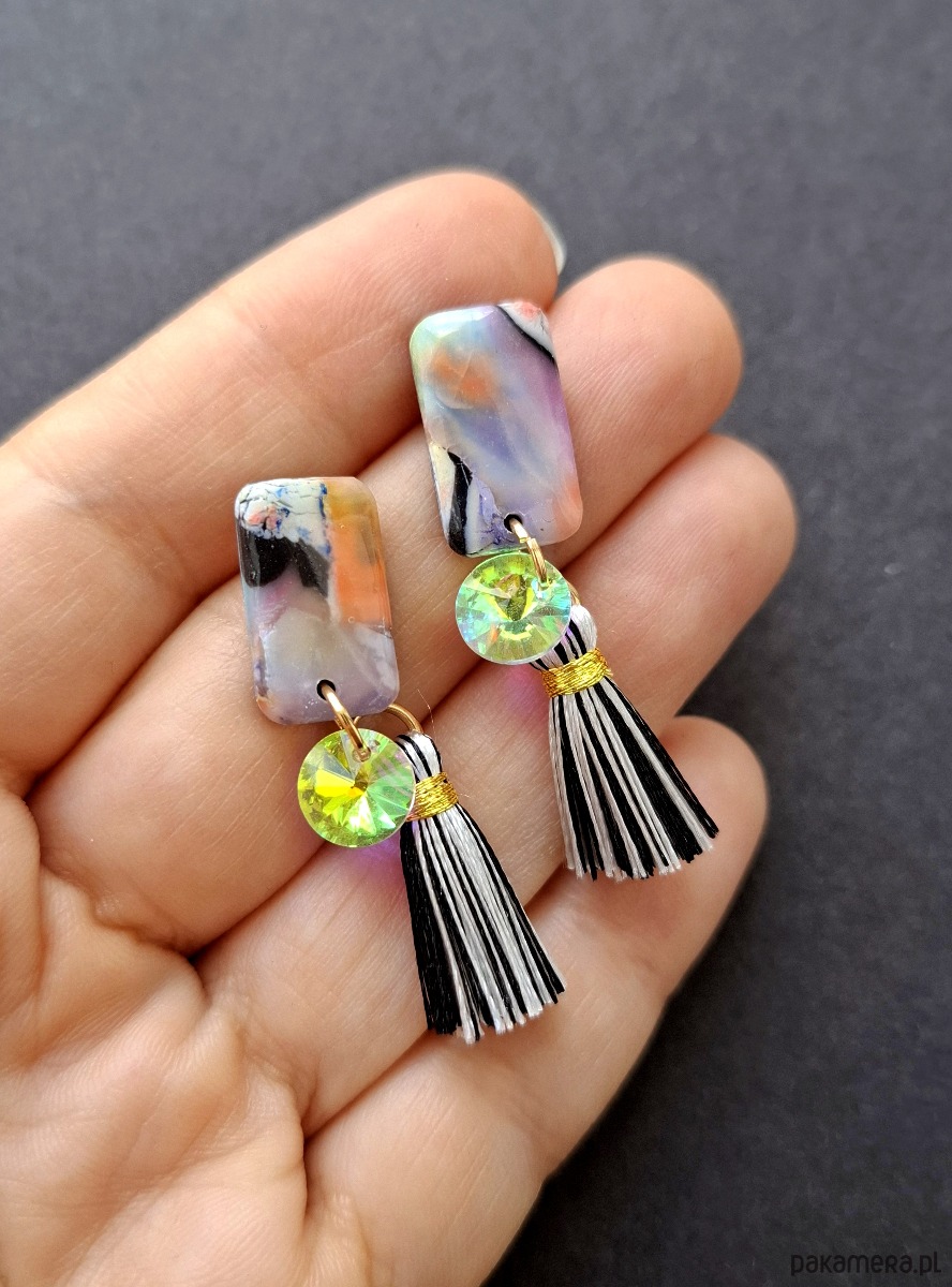 Drobne kolczyki na sztyft wykonane z wysokiej jakości glinki polimerowej z dodatkiem czarno białych chwostów oraz szklanych, błyszczących zawieszek. Sztyfty pozłacane i nieuczulające z klasycznymi zapięciami. Wymiary - długość całkowita: 4,5 cm; szerokość max. 0,9 cm.