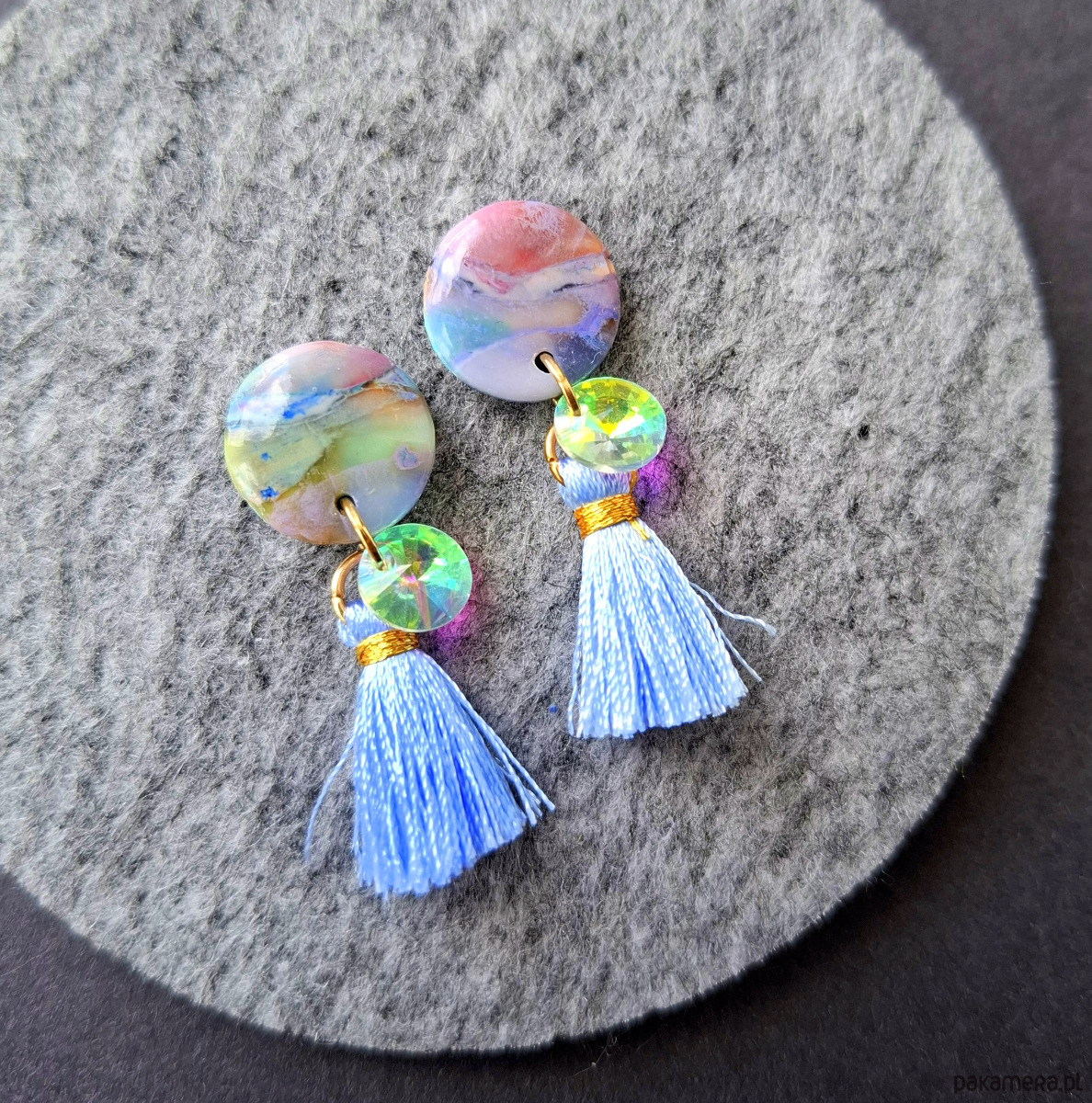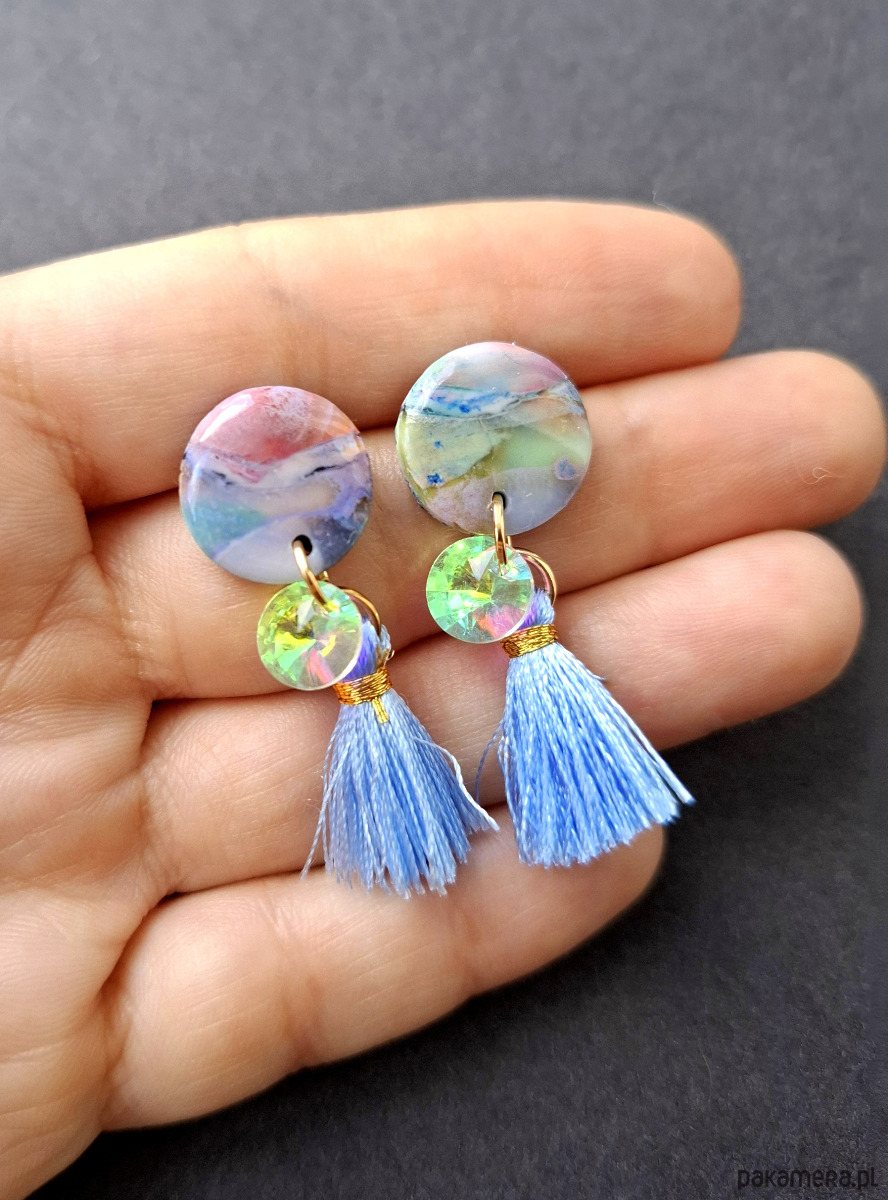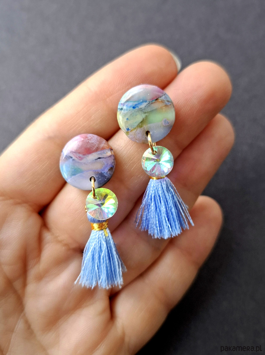 Drobne kolczyki na sztyft wykonane z wysokiej jakości glinki polimerowej z dodatkiem czarno białych chwostów oraz szklanych, błyszczących zawieszek. Sztyfty pozłacane i nieuczulające z klasycznymi zapięciami. Wymiary - długość całkowita: 4,5 cm; szerokość max. 1,2 cm.
