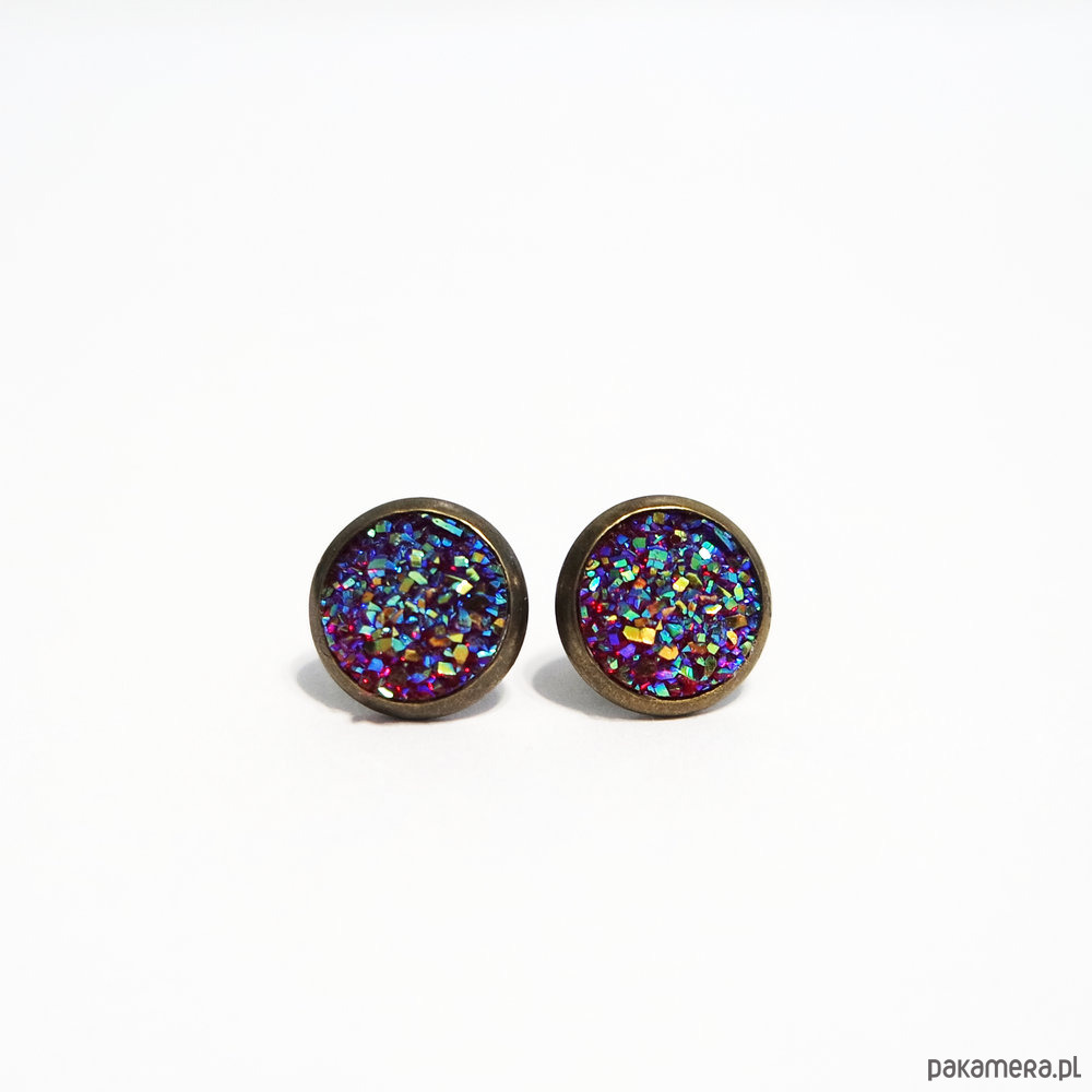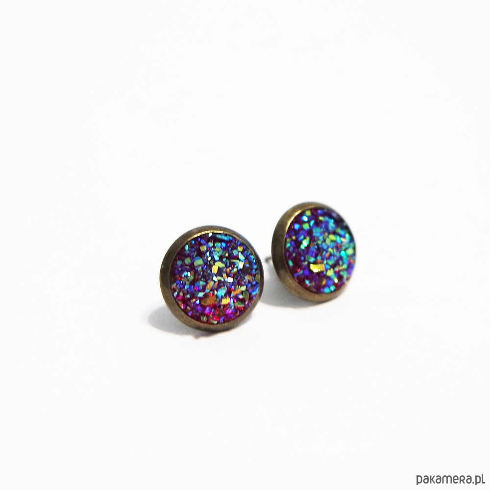 Oryginalne kolczyki z kaboszonem z żywicy - druzy, mieniący się w odcieniach burgundu, niebieskiego i złota.