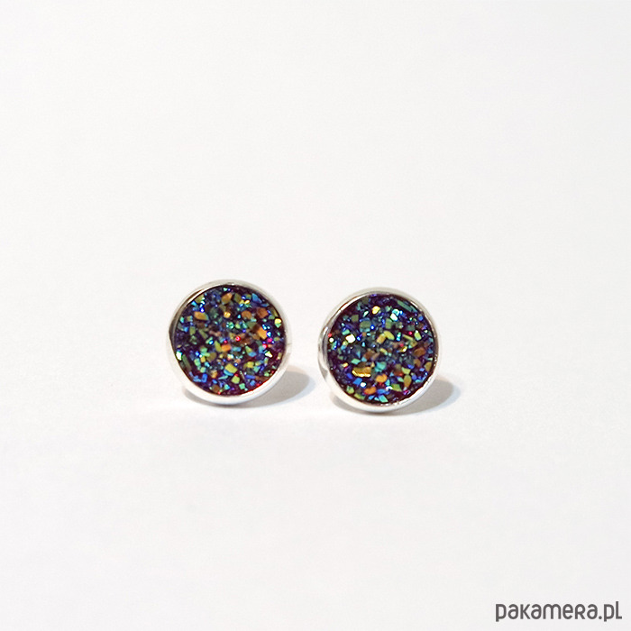 Oryginalne kolczyki z kaboszonem z żywicy - druzy, mieniący się w odcieniach burgundu, niebieskiego i złota.