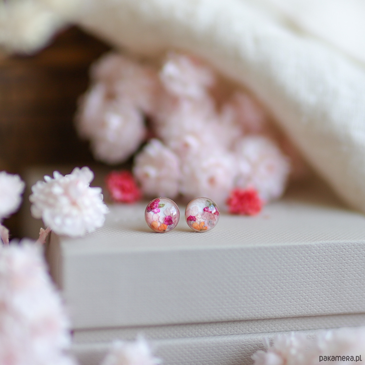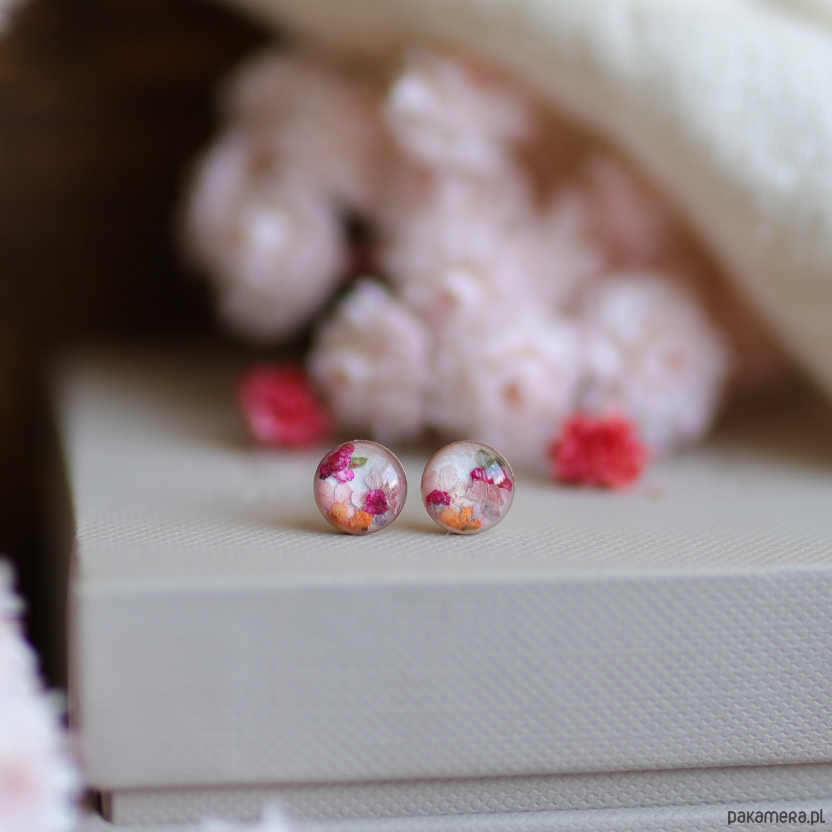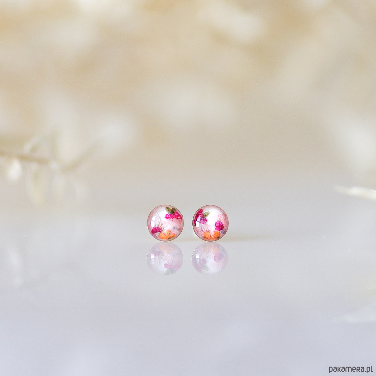 Zachwycające, drobne kolczyki z suszonymi letnimi kwiatami zatopionymi w żywicy, prezentujące żywe odcienie różu i pomarańczy.