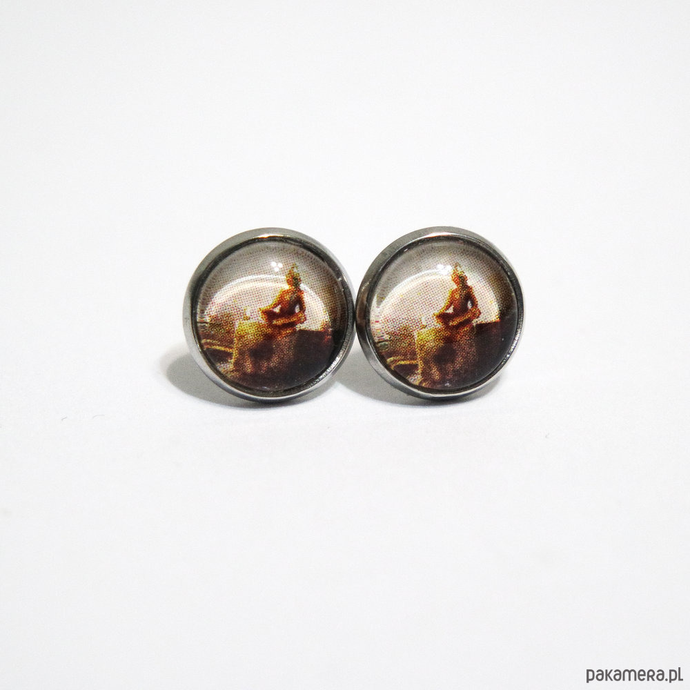 Grafika ukryta w delikatnych kolczykach, pod osłoną przeźroczystego półokrągłego szkiełka.
