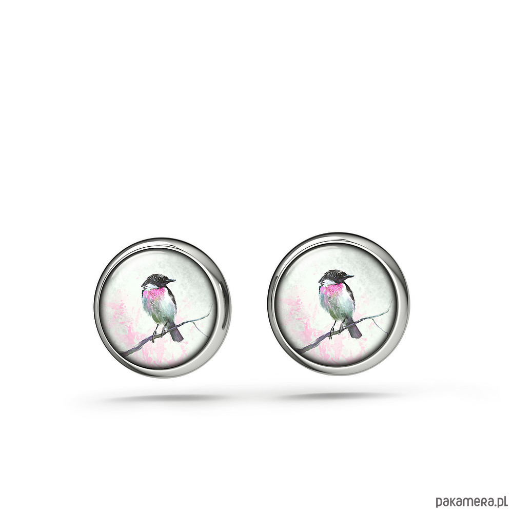 Grafika ukryta w delikatnych, małych kolczykach, pod osłoną przeźroczystego półokrągłego szkiełka.