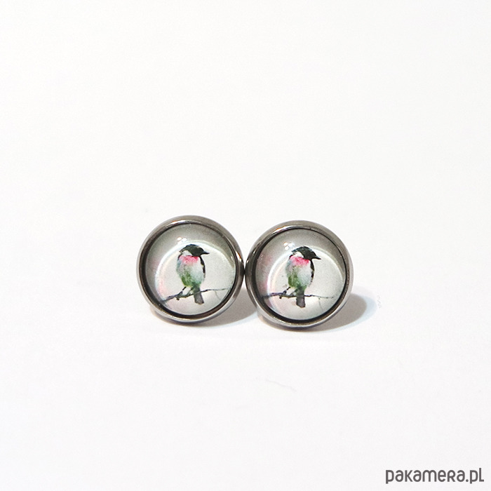 Grafika ukryta w delikatnych, małych kolczykach, pod osłoną przeźroczystego półokrągłego szkiełka.