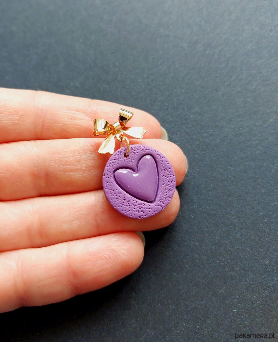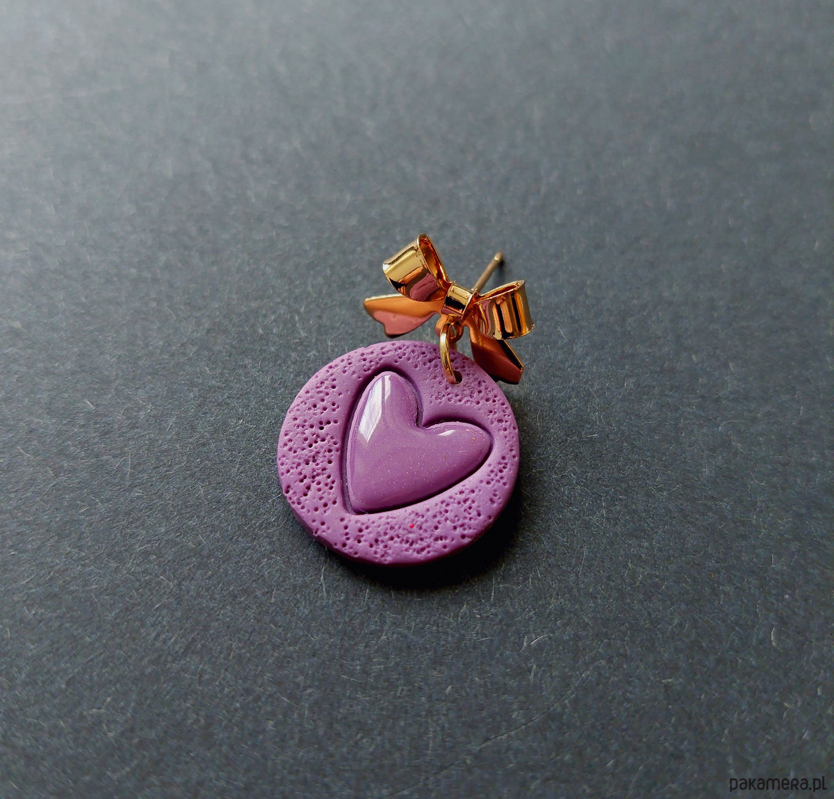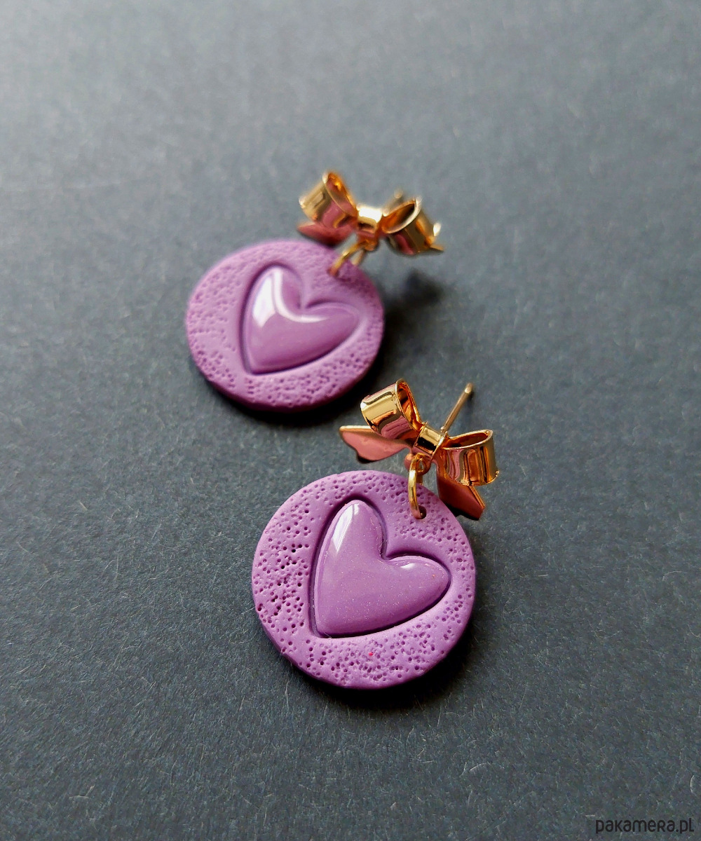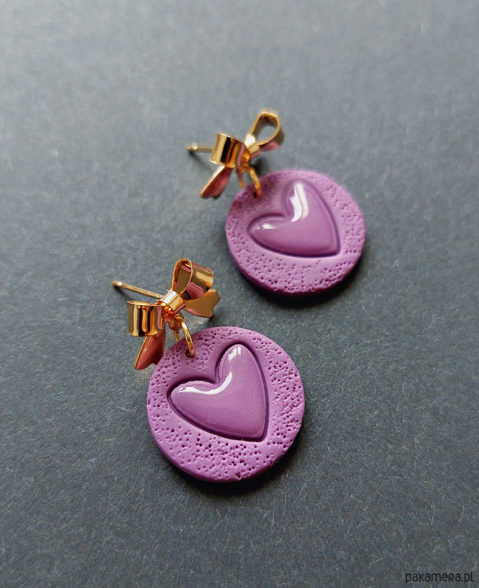 Lekkie kolczyki na ozdobne sztyfty wykonane z wysokiej jakości glinki polimerowej w fiolecie. Kolczyki jednostronne, podwieszone na pozłacanych i nieuczulających sztyftach z zapięciem na klasyczne baranki. Wymiary: długość całkowita: 3 cm, szerokość max 2 cm.