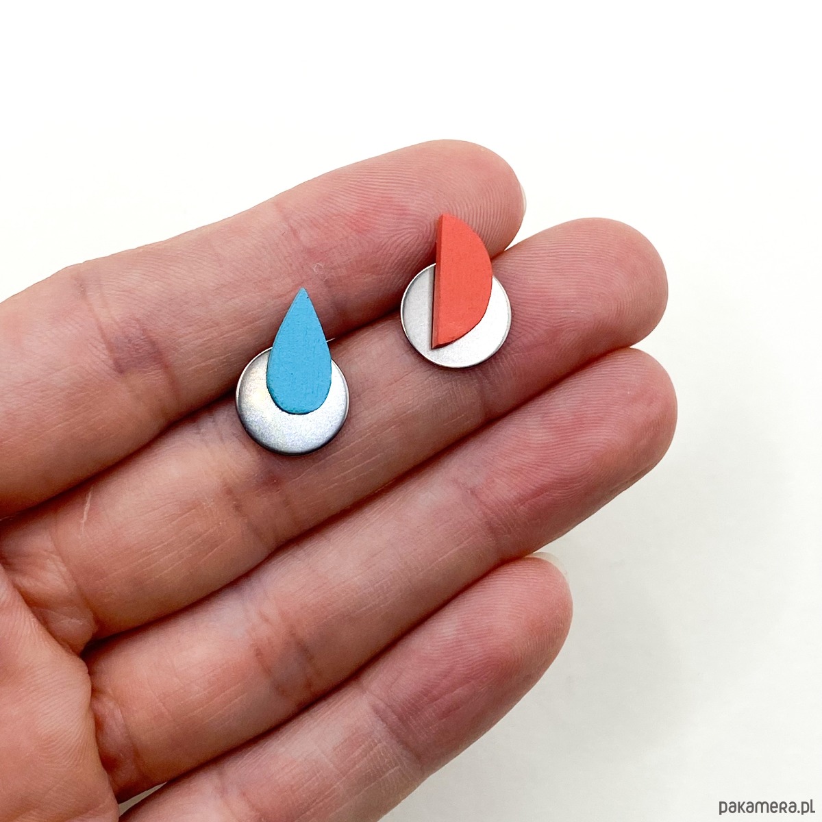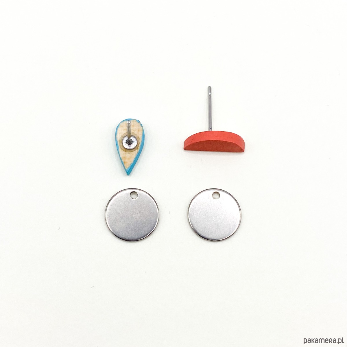 Malutkie drewniane kolczyki w zestawie ze stalowymi blaszkami w odcieniu srebra.