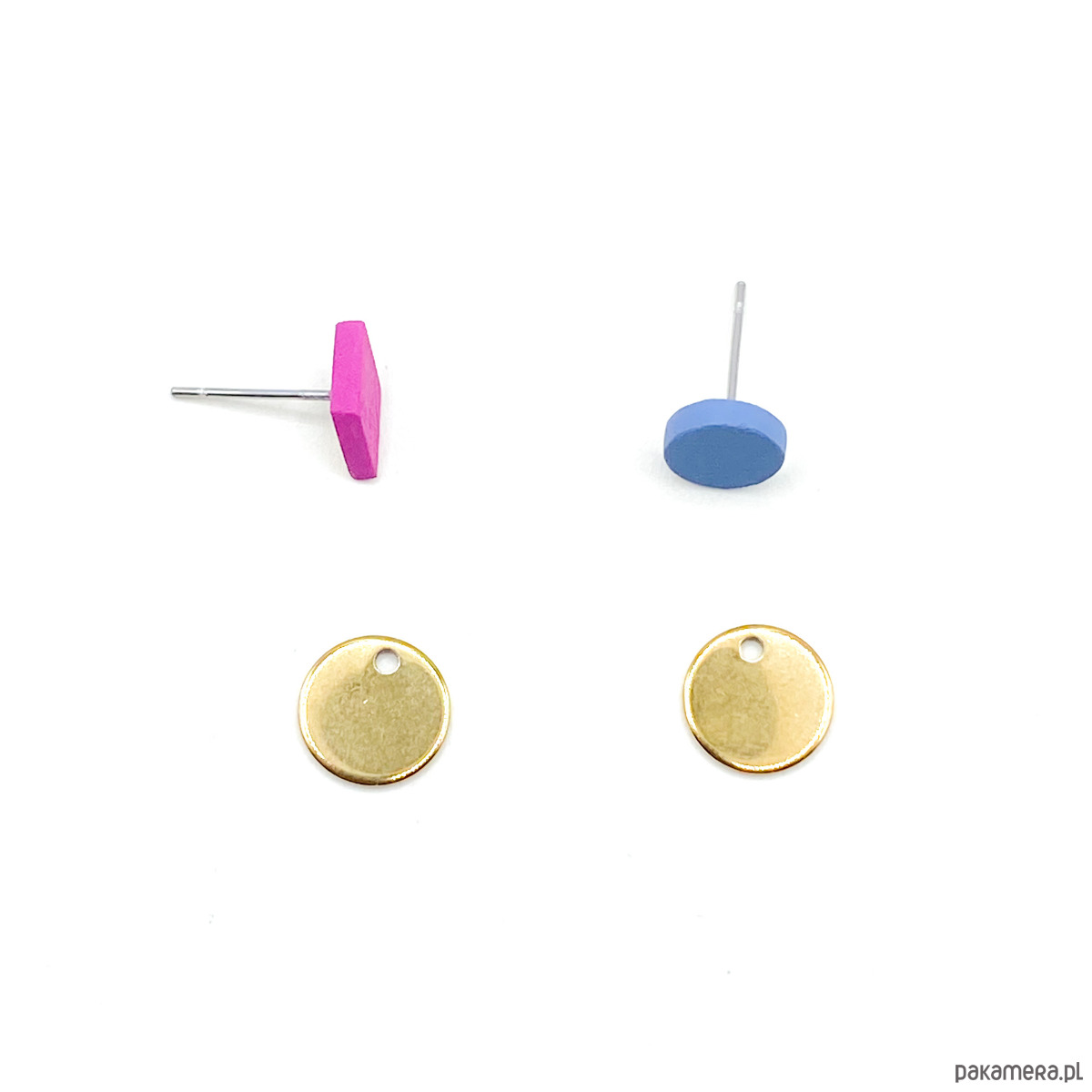 Malutkie drewniane kolczyki w zestawie ze stalowymi blaszkami w odcieniu złota.