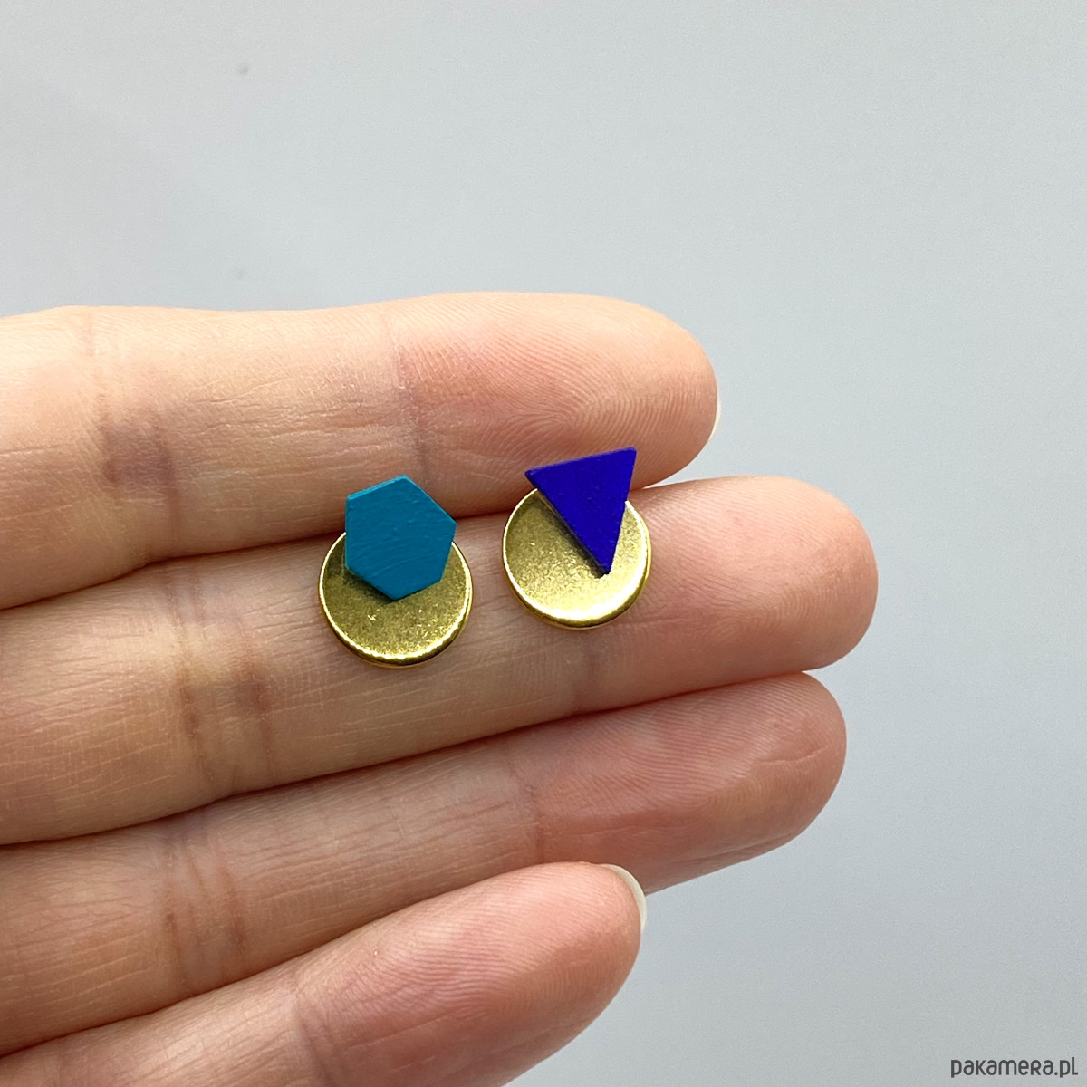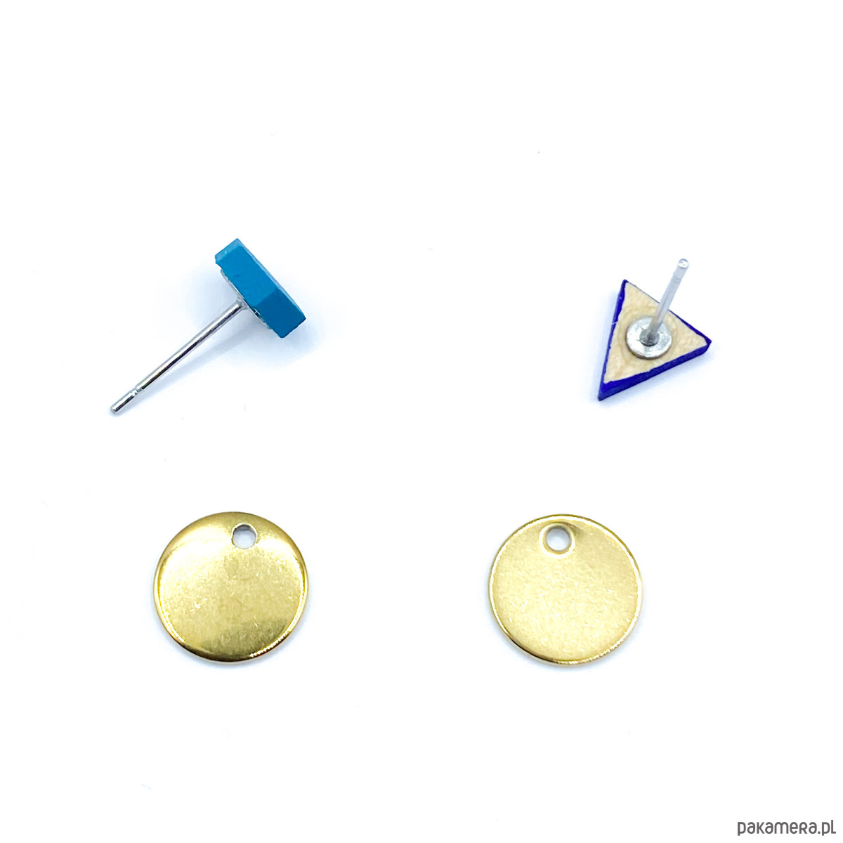 Malutkie drewniane kolczyki w zestawie ze stalowymi blaszkami w odcieniu złota.