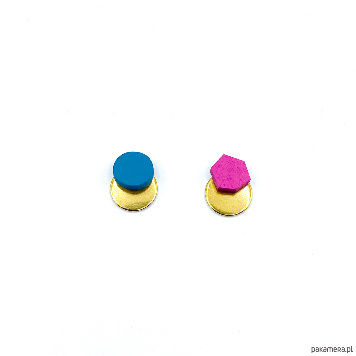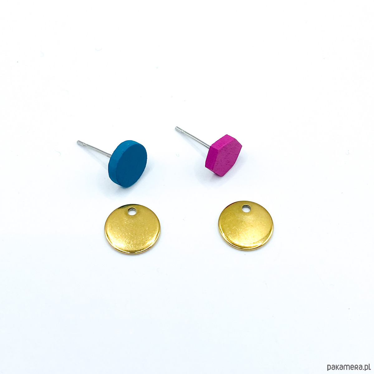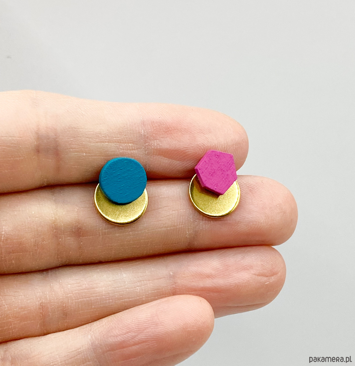 Malutkie drewniane kolczyki w zestawie ze stalowymi blaszkami w odcieniu złota.