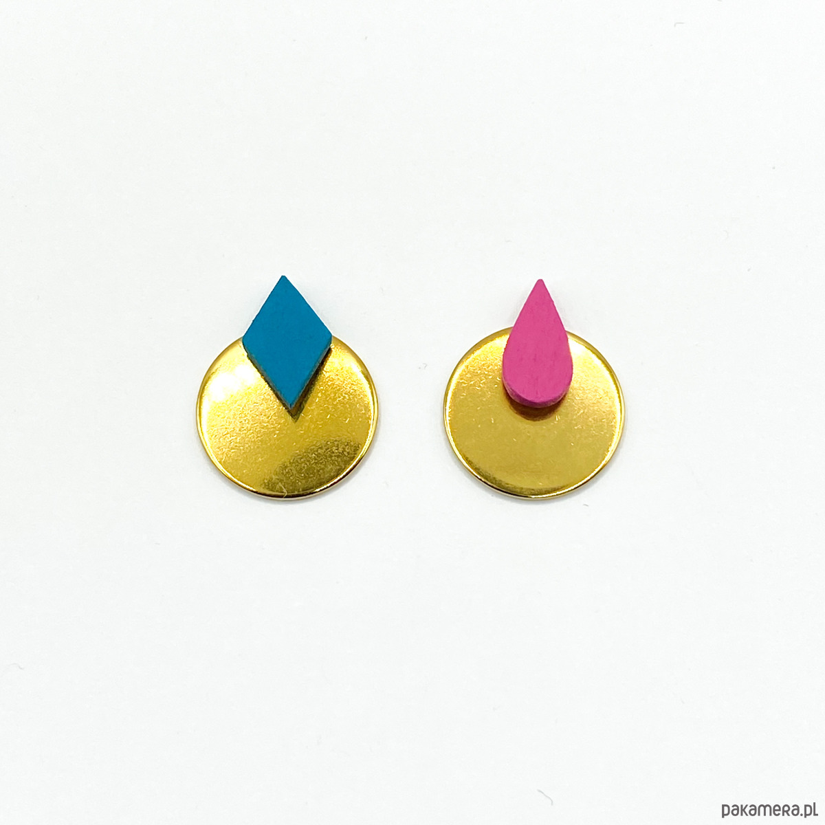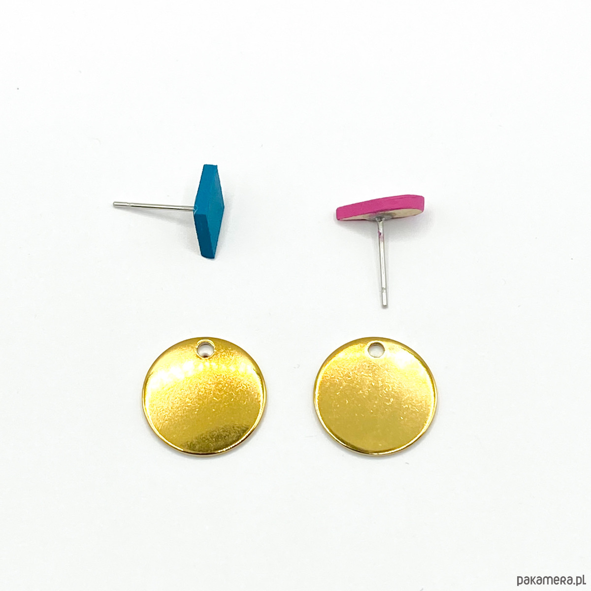 Malutkie drewniane kolczyki w zestawie ze stalowymi blaszkami w odcieniu złota.