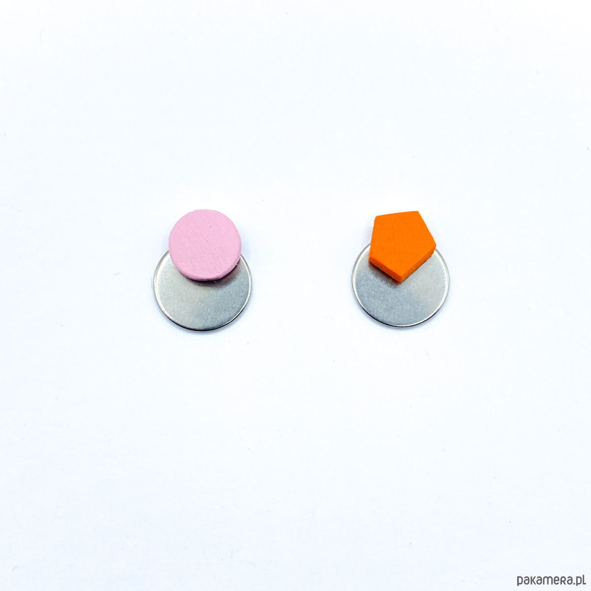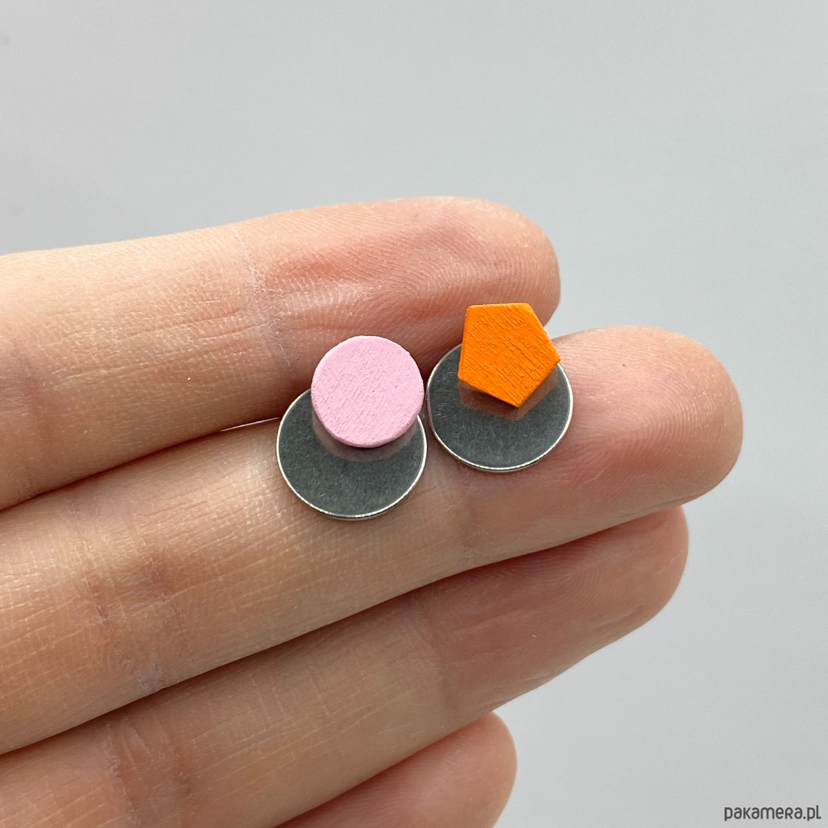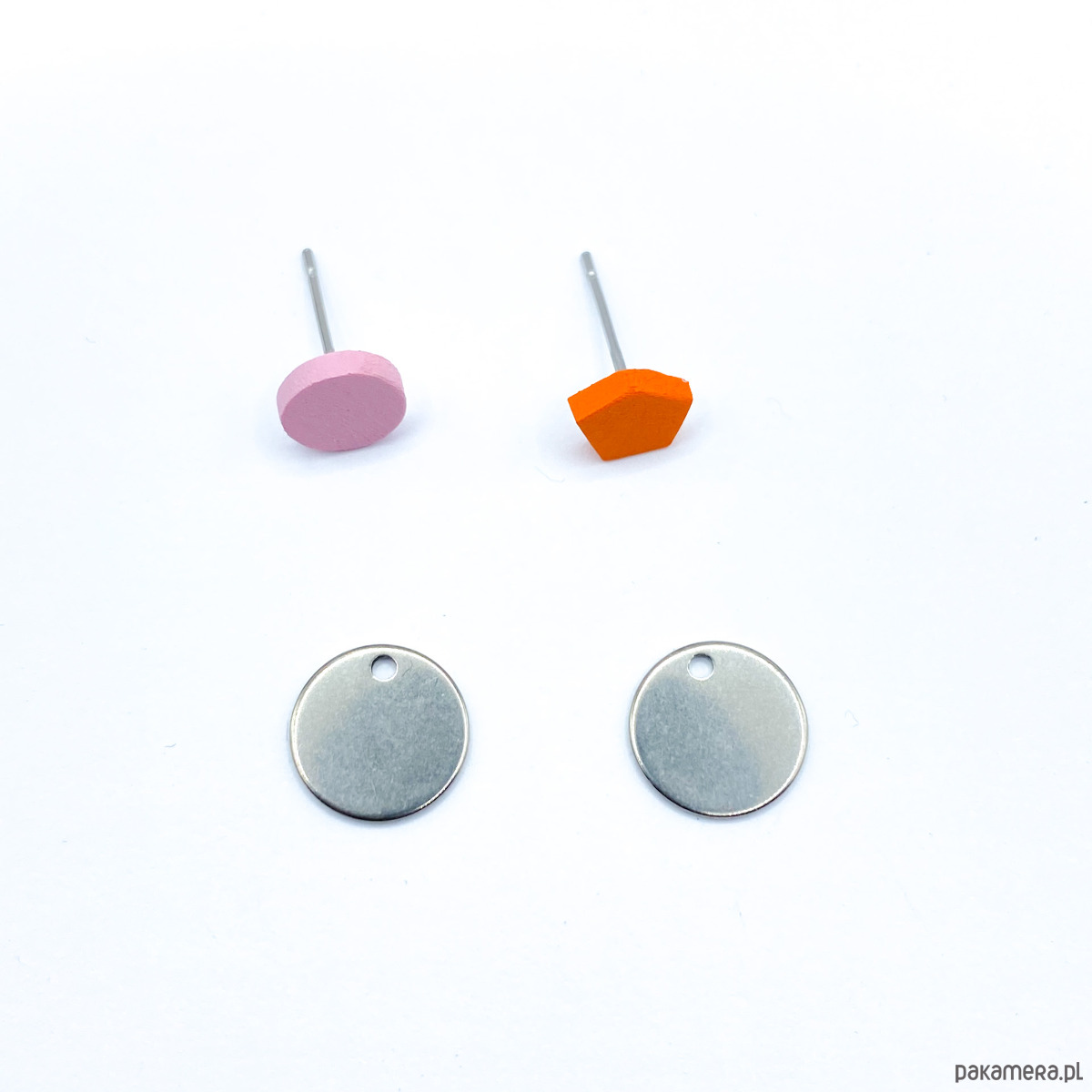 Malutkie drewniane kolczyki w zestawie ze stalowymi blaszkami w odcieniu srebrnym.