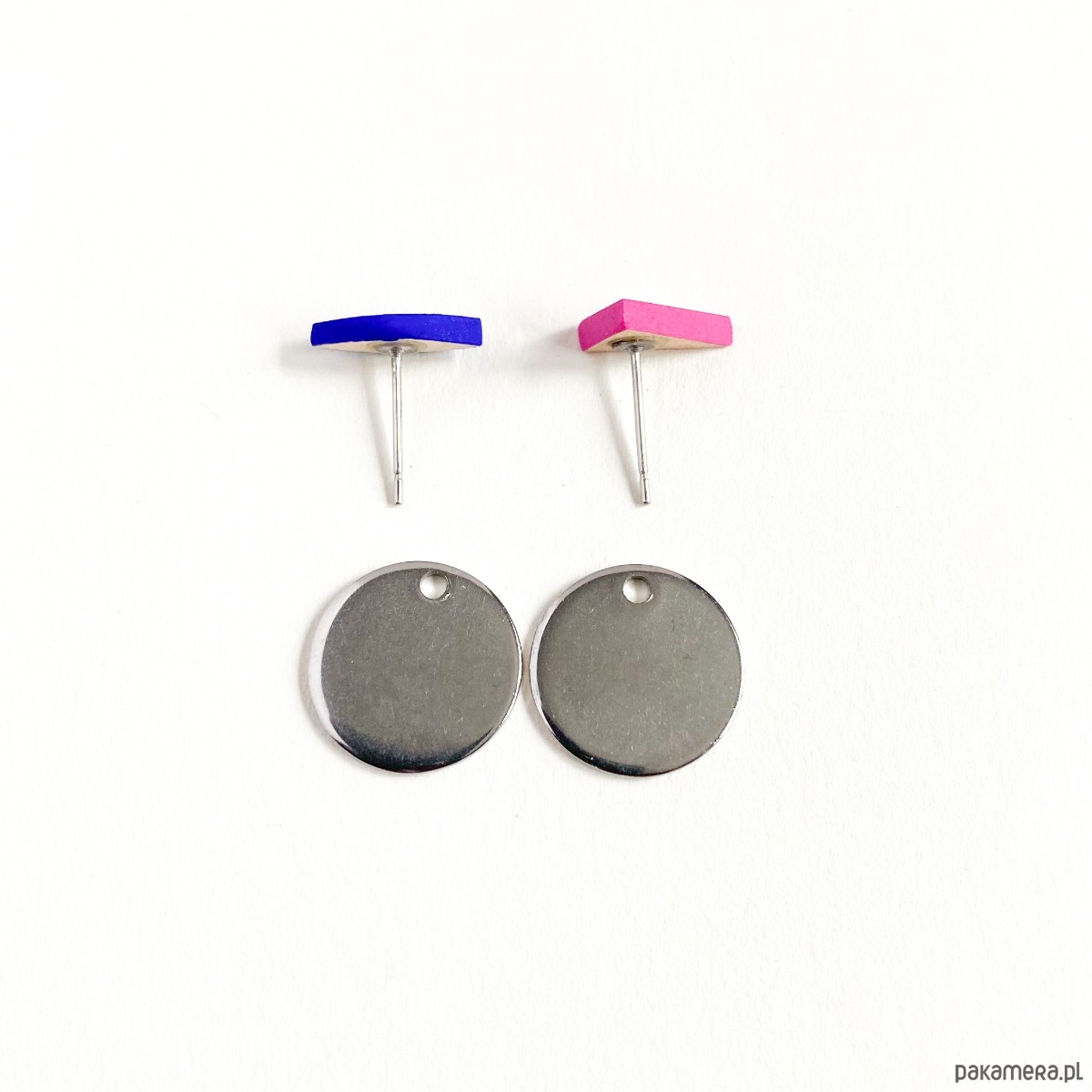 Malutkie drewniane kolczyki w zestawie ze stalowymi blaszkami w odcieniu srebra.