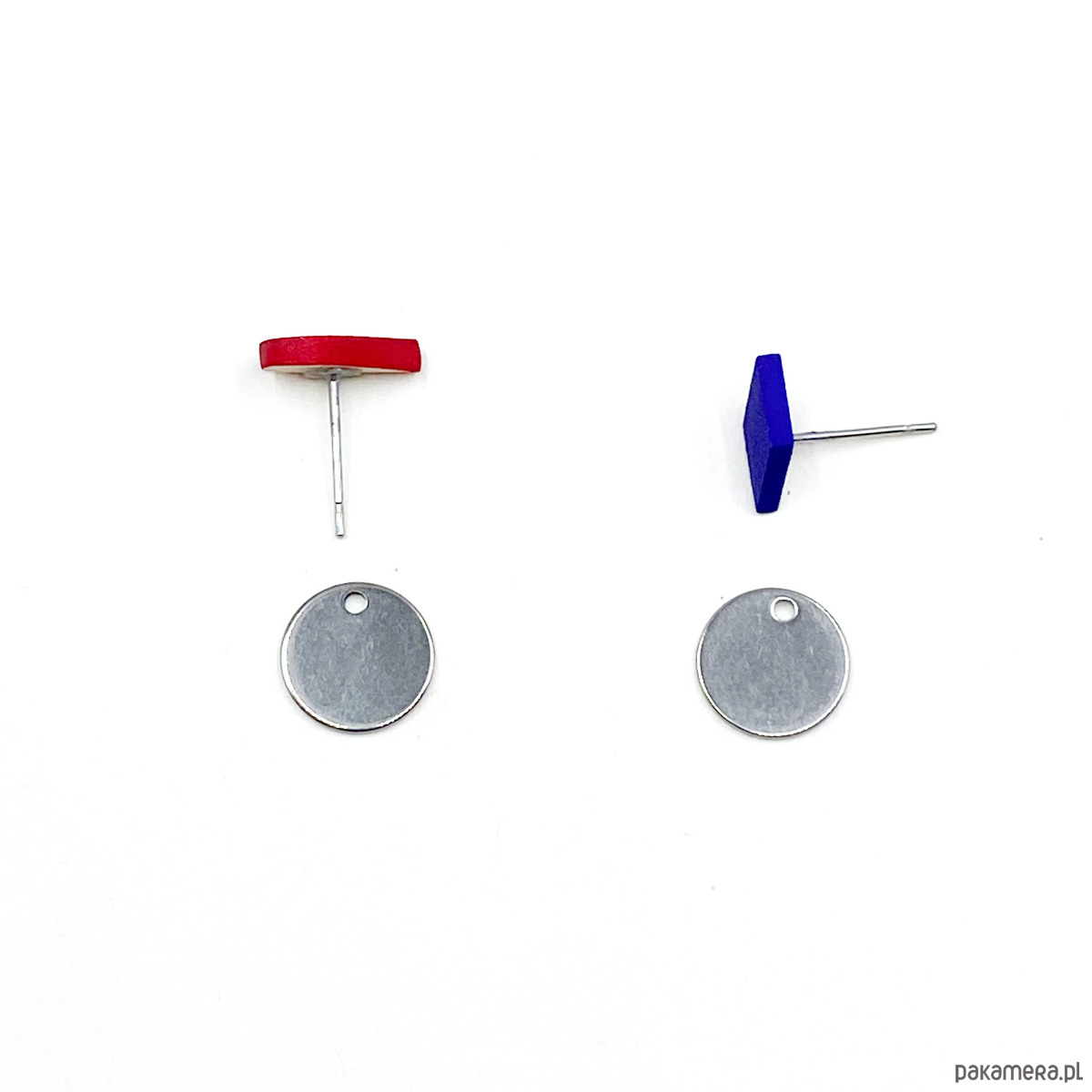 Malutkie drewniane kolczyki w zestawie ze stalowymi blaszkami w odcieniu srebra.